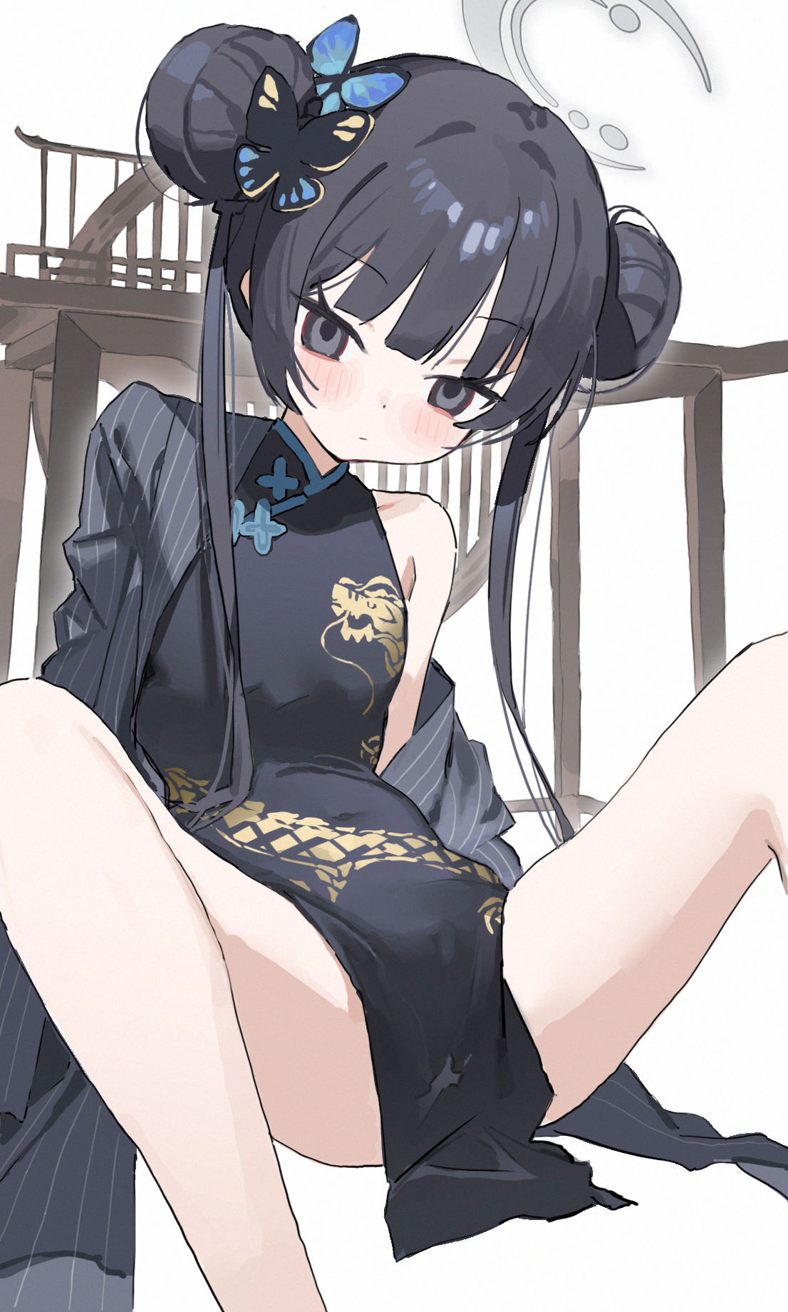 1girlblack dressblack hairbutterfly hair ornamentchina dresschinese clothesdouble bundragon printdresshair bunhair ornamenthalolong hairsolotwintails