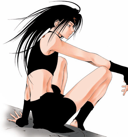 00s1boyandrogynousblack hairboredfingerless glovesglovesheadbandlong hairmale focusmidriffprofilered eyessittingskin tightskirtsleevelesssockssolotattoo