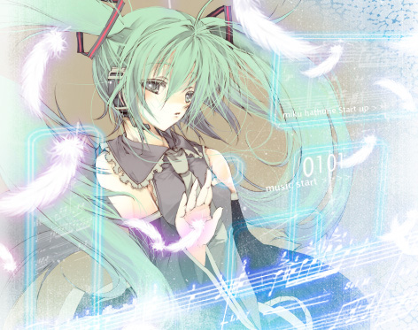 aqua hairblue eyesdetached sleevesfeathersheadsetlong hairnecktieskirtsolotwintailsvery long hair