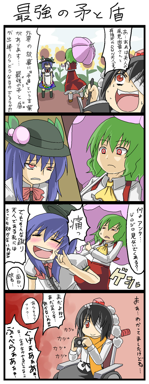 kaho 0102, hiyama kiyoteru, kaai yuki, sf-a2 miki, vocaloid, commentary request, highres, 1boy, 2girls, :d, ahoge, black jacket, blue necktie, blush, brown eyes, brown hair, character name, closed eyes, closed mouth, collared shirt, glasses, grin, hair bobbles, hair ornament, jacket, low twintails, multiple girls, necktie, open mouth, parted bangs, red eyes, red hair, red vest, shirt, short hair, short sleeves, short twintails, smile, twintails, upper body, vest, white shirt