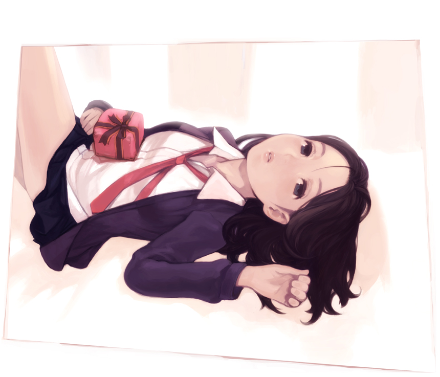 1girlbare legsblack hairblushboxfemale focusgiftgift boxknees uplong hairlong sleeveslooking at viewerlyingnecktieon backpleated skirtred ribbonribbonschool uniformskirtsolo