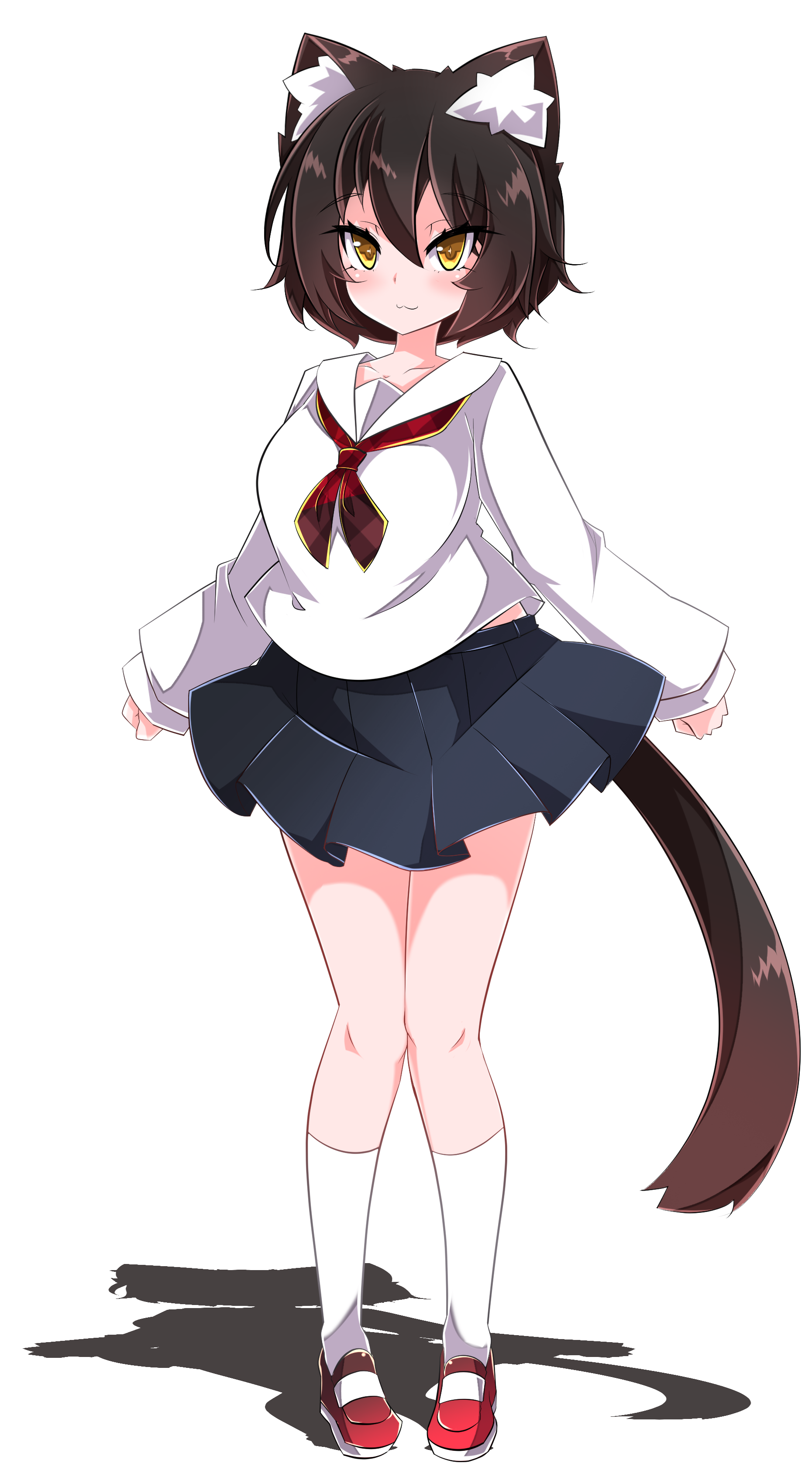 1girlanimal earsblack hairblack skirtblushbreastsbrown haircat earscat girlcat tailfull bodylarge breastslooking at viewerneckerchiefred neckerchiefsailor collarshirtshort hairsimple backgroundskirtsmilesockssolotailwhite backgroundwhite sailor collarwhite shirtwhite socksyellow eyes