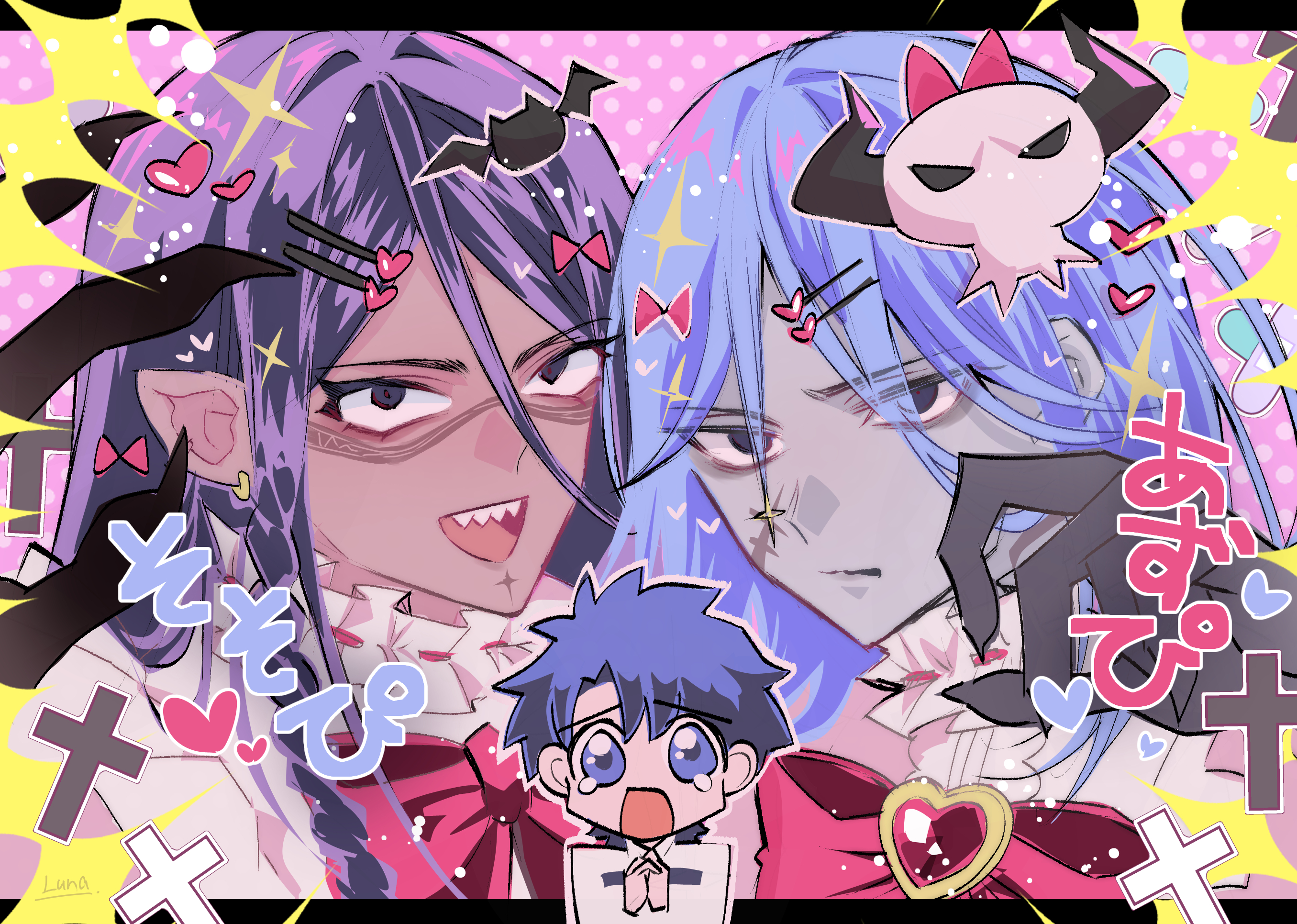 3boysazrael (grand assassin) (fate)bags under eyesblack eyesblue hairbowcolored skindark skindark-skinned maledeformedfacial scarfacial tattoogrey skinhair between eyeshair bowhair ornamenthairclipheartlong hairmale focusmultiple boysopen mouthown hands togetherpointy earspurikurapurple hairscarscar on cheekscar on faceshort hairskull hair ornamentsmiletattootearing up
