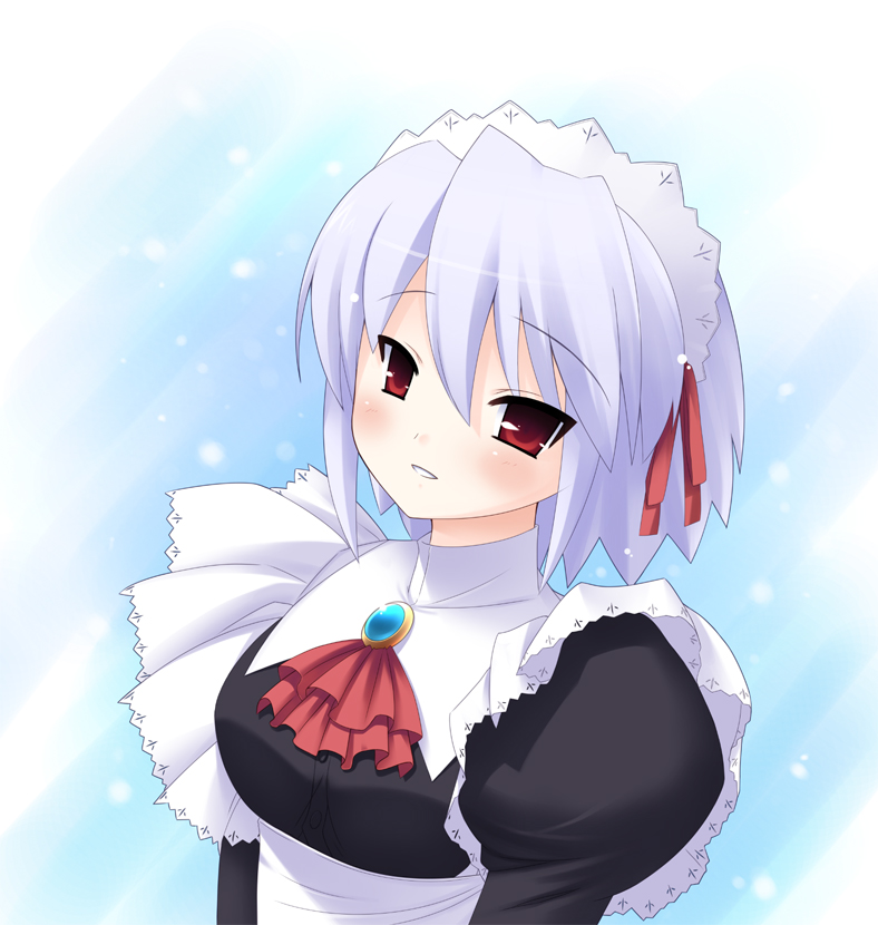 1girlapronblushfemale focusfrillsjuliet sleeveslong sleeveslooking at viewermaidmaid apronmaid headdresspuffy long sleevespuffy sleevesred eyesshort hairsoloupper body
