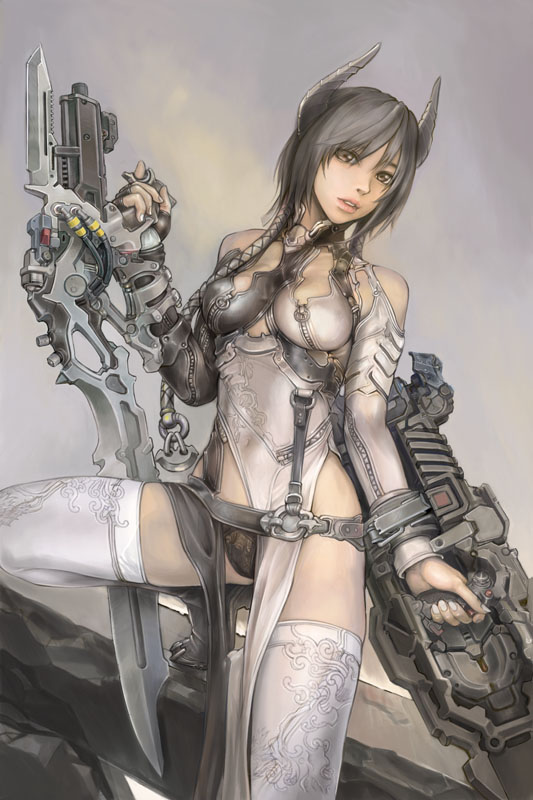 1girlbare shouldersblack hairdressfemale focushornspantiessolostrapswordthighhighstwintailsunderwearweaponyellow eyes