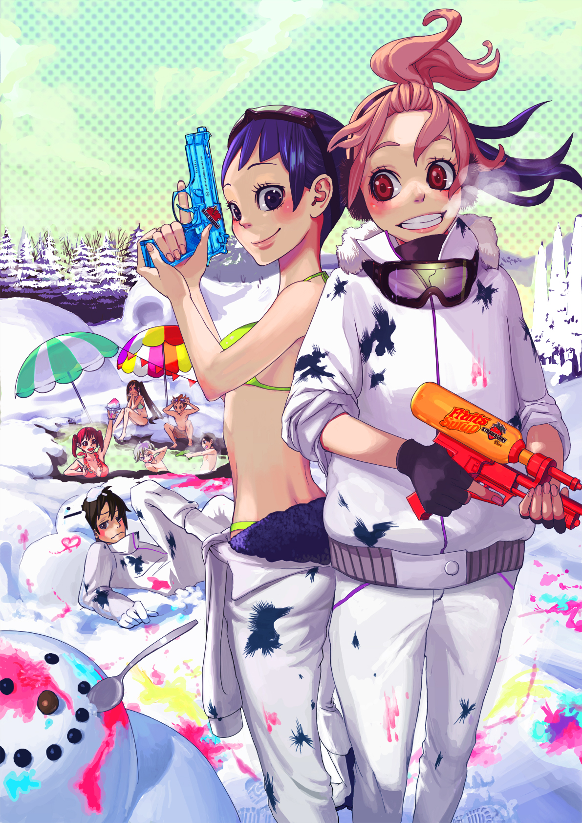 4boys4girlsbikiniblonde hairbrown haircoatfoodgogglesgrinjumpsuitmultiple boysmultiple girlsonsenpink hairpurple eyespurple hairred eyesred hairshaved icesmilesnowsnowmanspoonswimsuitsyruptrigger disciplineumbrellawater gunweapon