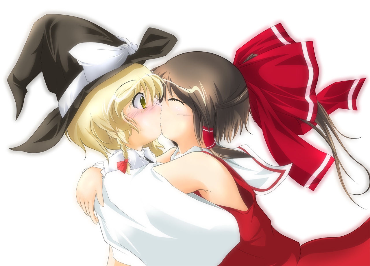 2girlsbare shouldersblonde hairblushbowbraidbrown hairdetached sleevesfemale focushair ribbonhalf updohatjapanese clotheskissmikomultiple girlsponytailribbonsurprisedwhite backgroundwitchwitch hatyuri