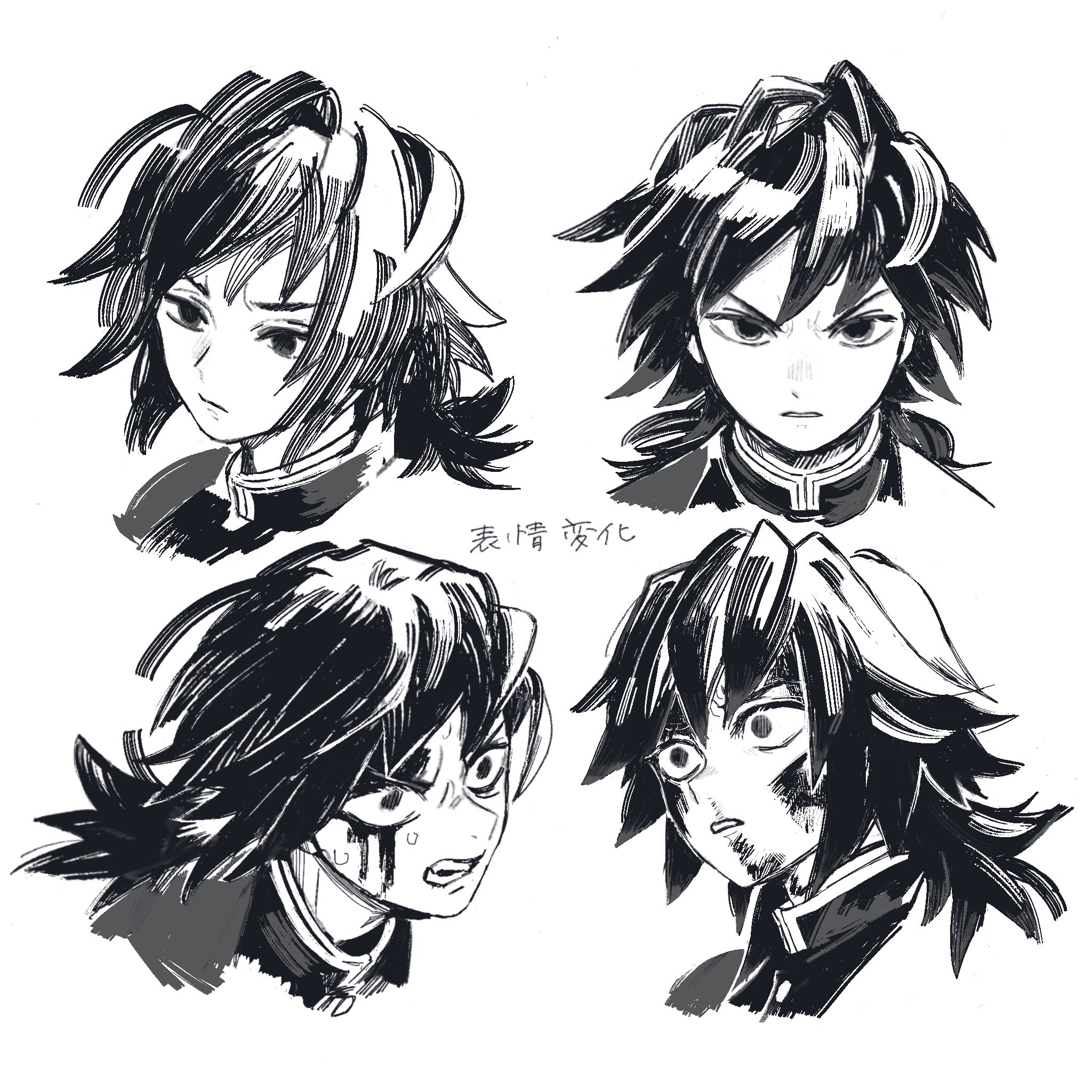 1boybloodbuttonsclosed mouthcropped shouldersdemon slayer uniformgreyscalehair between eyeshigh collarjacketlooking at viewerlow ponytailmale focusmonochromemultiple viewsponytailsimple backgroundsolospiked hairsweatteethtoka rieupper bodyv-shaped eyebrowswhite background