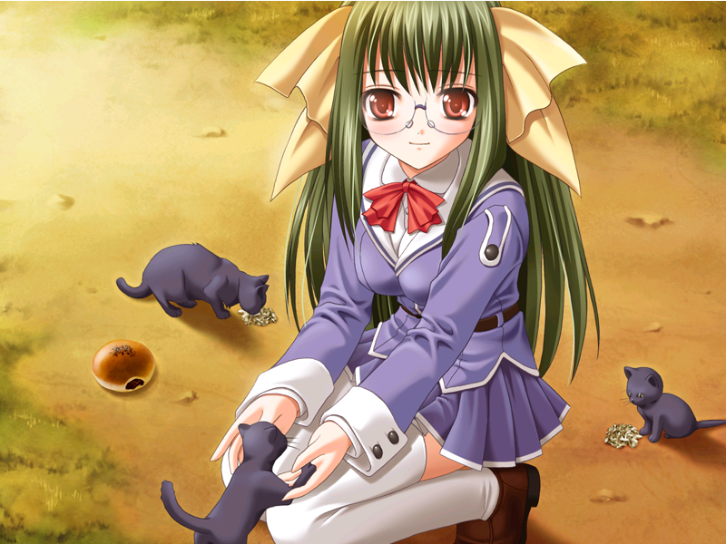 1girlanpanbaby animalblack catcatfemale focusfoodglassesgreen hairkittenlong hairred eyesschool uniformsolosquattingthighhighswhite thighhighs