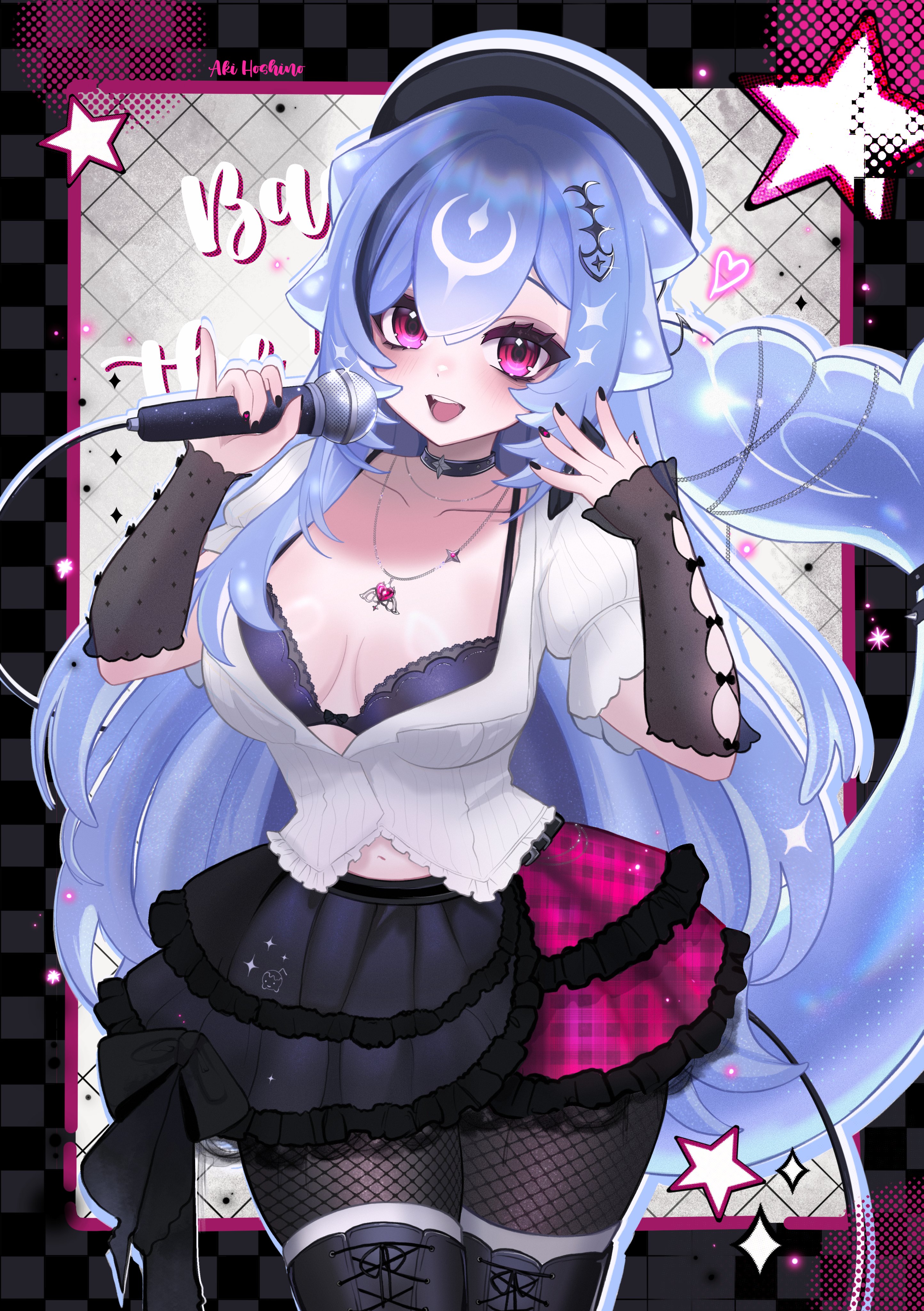 eternalfeatherx, original, absurdres, commission, highres, pixiv commission, 1boy, 1girl, bed, black jacket, black thighhighs, blazer, blue skirt, breasts, cowgirl position, curtains, grabbing another's breast, groping, hand on another's thigh, jacket, long hair, medium breasts, necktie, on bed, pleated skirt, ponytail, red hair, red necktie, school uniform, sex, skirt, smile, straddling, thighhighs, yellow eyes