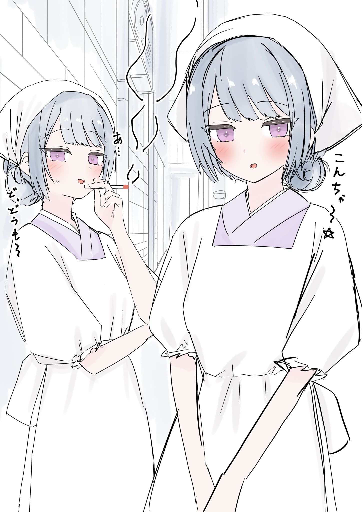 :o1girlalternate costumealternate hairstyleapronblushbrick wallcaughtcigarettehair bunheadscarfholdingholding cigarettejapanese clotheskappougikimonolooking at viewermolemole under eyemonochrome backgroundmultiple viewsown hands togetherparted lipspuffy short sleevespuffy sleevespurple eyespurple kimonoshort sleevesshu mascaratsingle hair bunsmokesmoke trailsmokingstandingstar (symbol)sweatdroptenuguivirtual youtuberwhite apronwhite headscarf