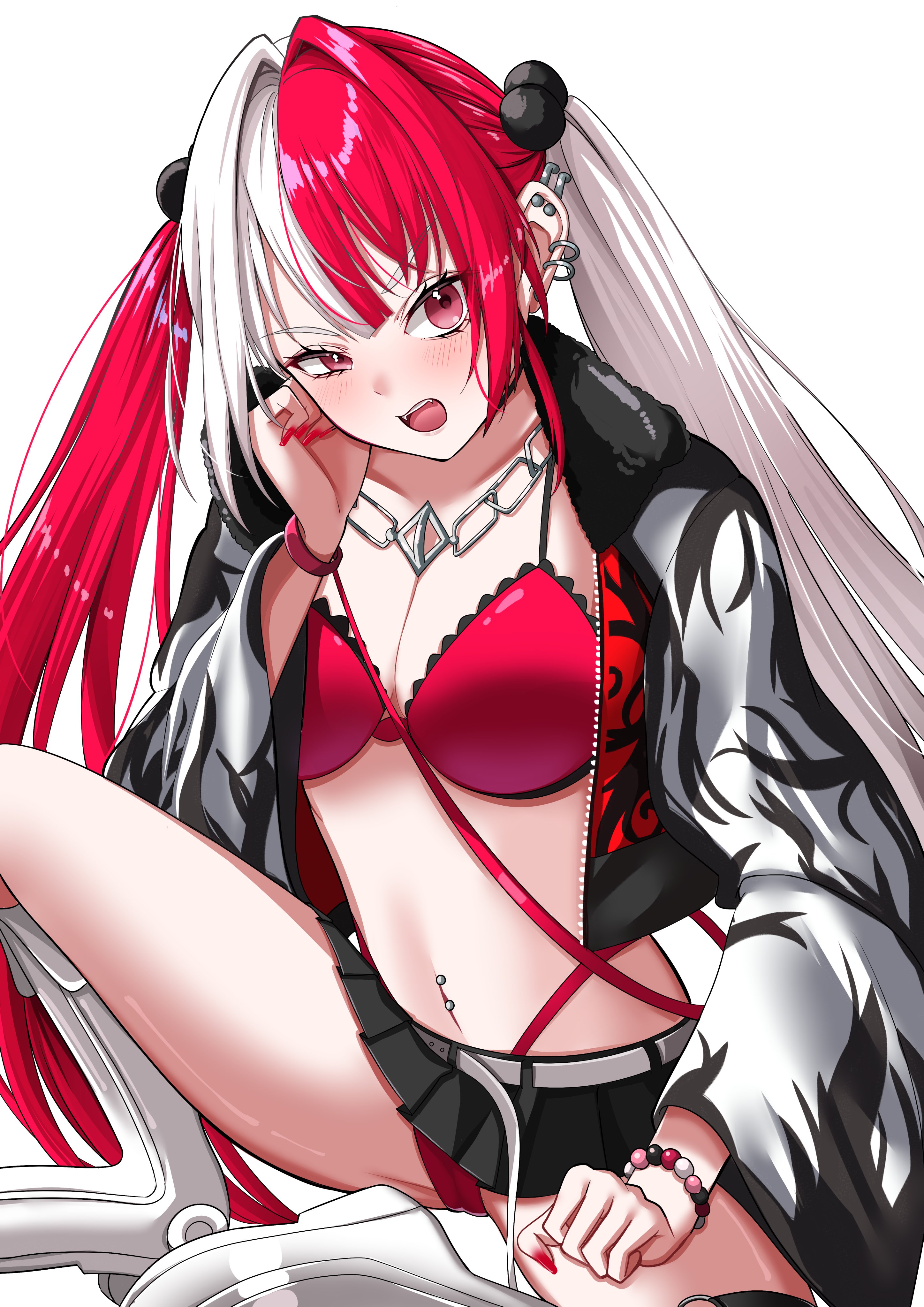 1girlbeltblack skirtbrabreastschainchain necklacefur collarhair bobbleshair ornamenthighleghighleg pantiesjacketjewelrylong hairminiskirtmulticolored hairnavel piercingnecklaceopen mouthpantiespiercingred brared eyesred hairred pantiesskirtsolosplit-color hairtwintailsunderwearwhite hair