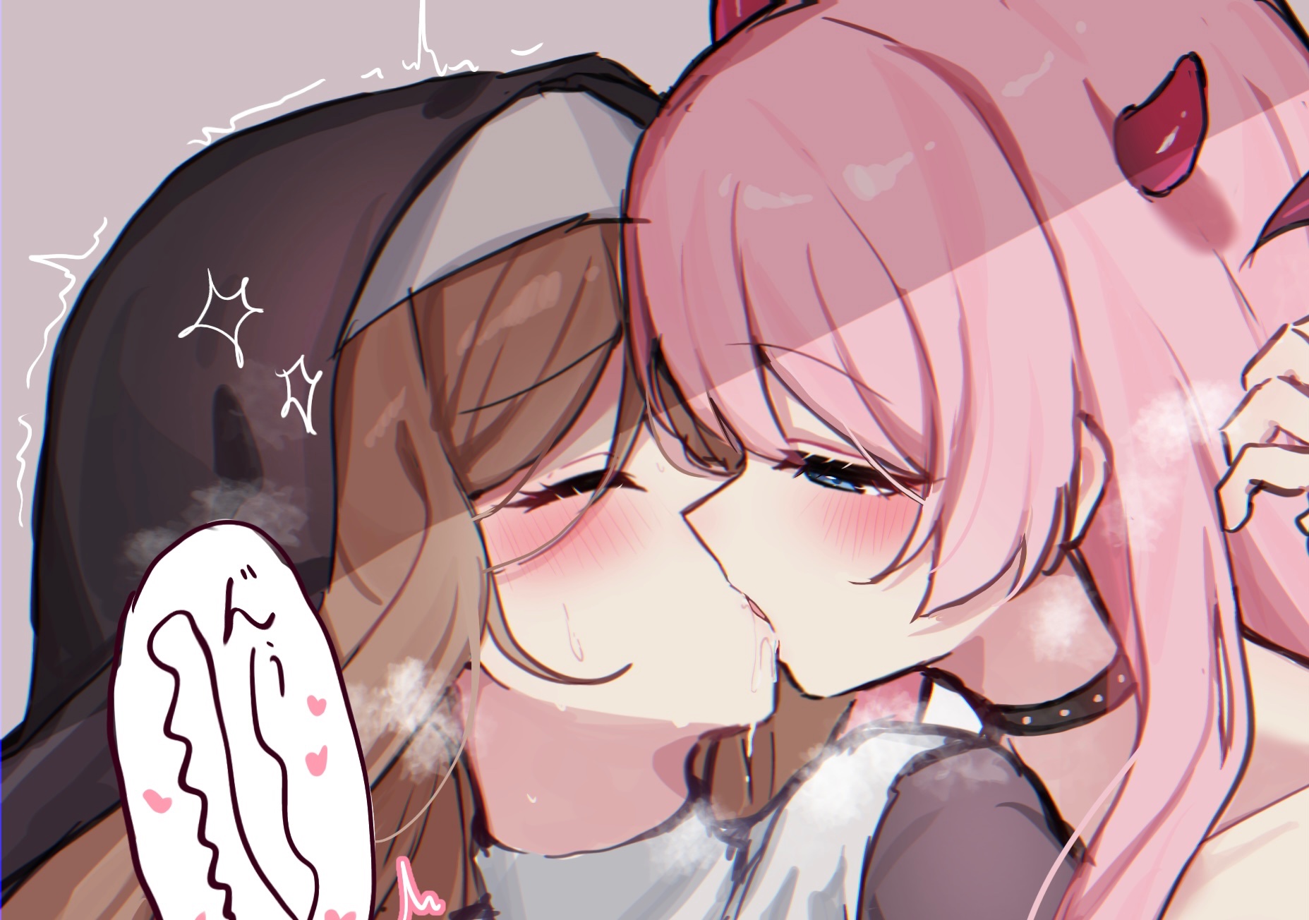 2girlsblushbrown hairclosed eyesfake hornsfrench kissgrey backgroundgrey eyeshornskissmultiple girlsnunpurple eyessalivatremblingyuri