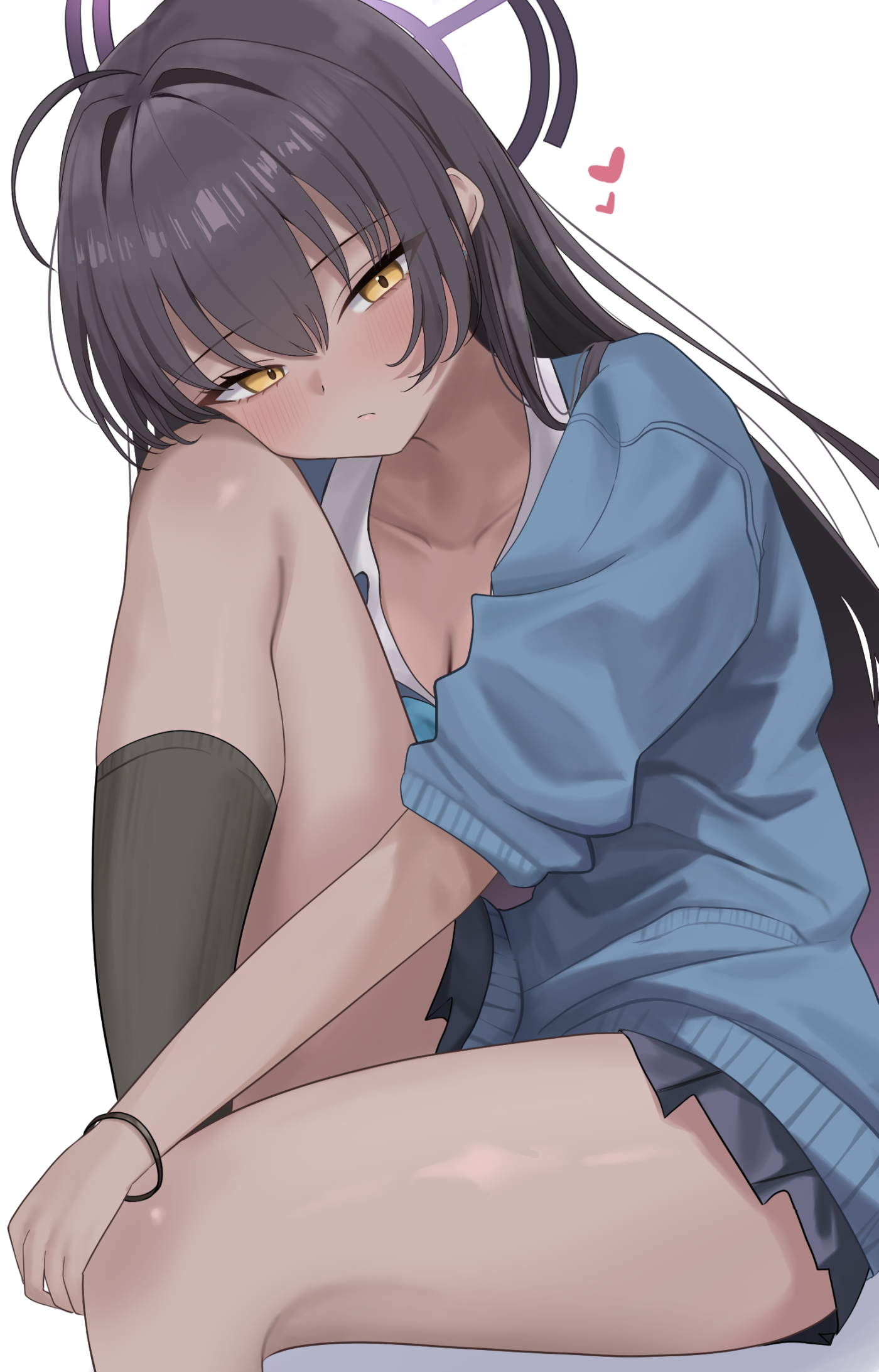 ahogeblack hairblack socksblue cardiganblue skirtblushbreastscardigancleavagedark skindark-skinned femalegradient hairhair between eyeshalolong hairmulticolored hairpleated skirtpurple hairpurple haloshirtsittingskirtsleeves rolled upsocksthighsvery long hairwhite shirtyellow eyes