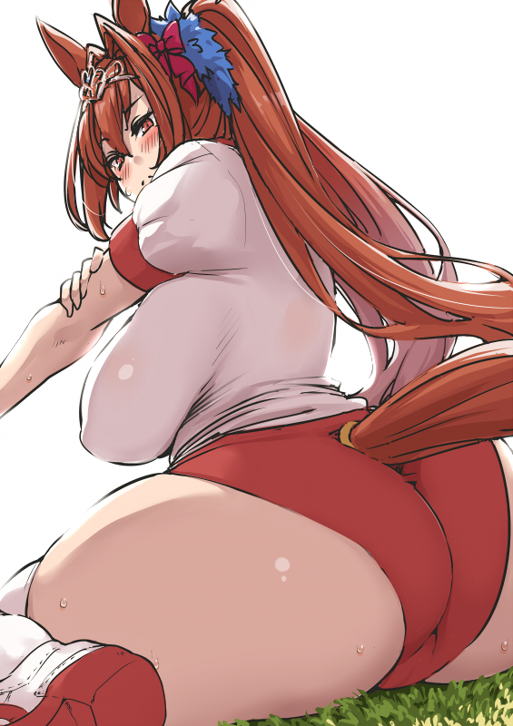 1girlanimal earsassblushbreastsburumacurvygrassgym uniformhair ornamenthorse earshorse tailhuge asshuge breastsred burumared hairribbonsimple backgroundsolosweattailwhite background