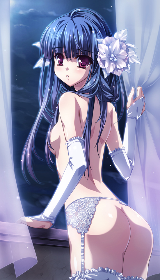 1girlassbackblue hairbreastsbridal gauntletscurtain grabcurtainselbow glovesfemale focusflowerfrilled thigh strapgarter beltgarter strapsgloveshair flowerhair ornamenthair over breastshair over one breastlacenightnight skypurple eyesskysolothigh strapthighhighstopless femalewhite garter beltwhite thighhighswindow