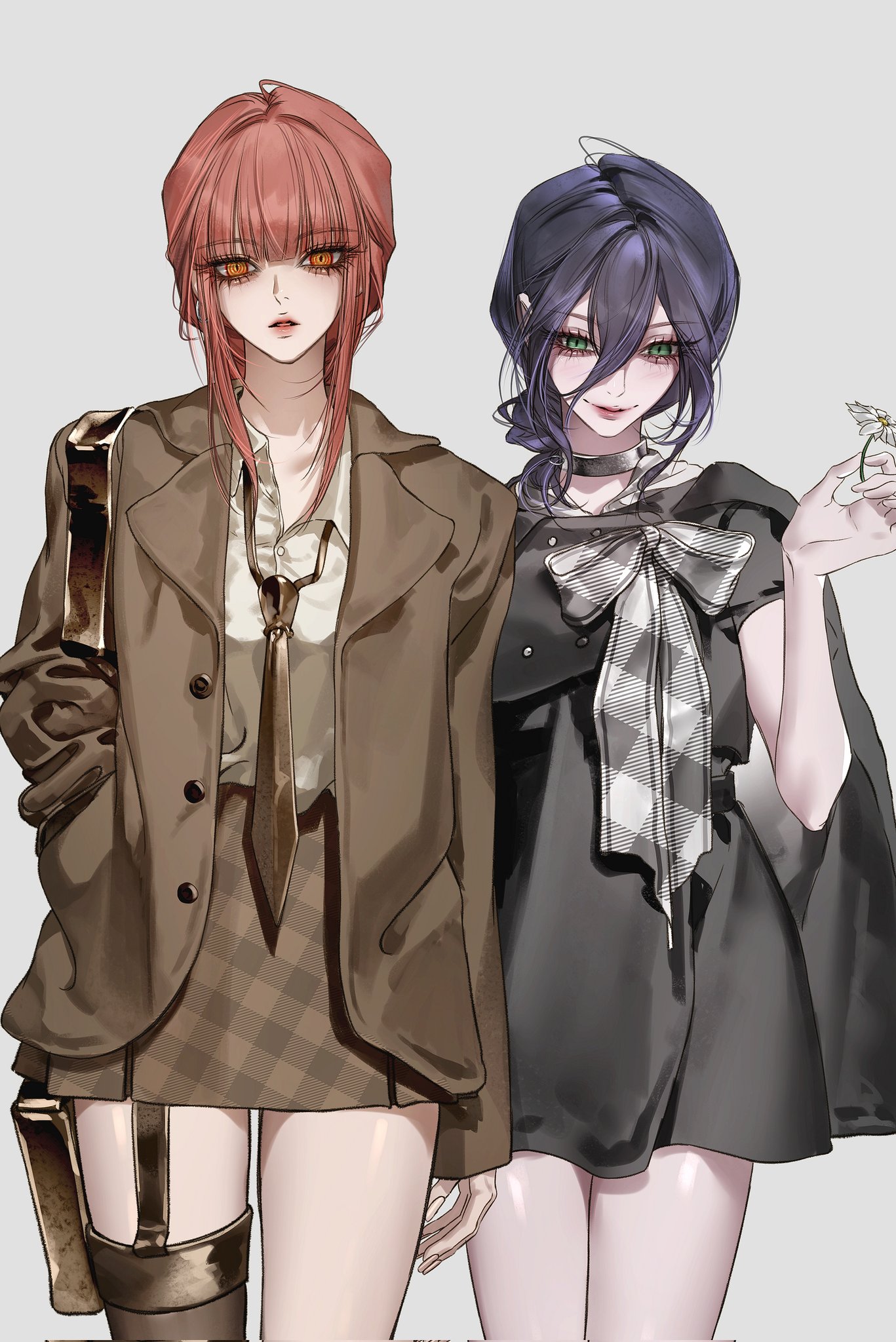 2girlsasymmetrical legwearbagblack chokerblack hairblack shirtblack skirtblunt bangsbowbrown bagbrown coatbrown necktiebrown thighhighschokercoatcollarbonecollared shirtcowboy shotflowergarter strapsgreen eyeshair between eyeshair intakeshand in pockethandbagholdingholding flowerlong sidelockslooking at viewerloose necktiemultiple girlsnecktieopen collarorange eyesparted lipsplaid bowplaid clothesplaid skirtred hairringed eyesshirtshort sleevessidelocksskirtsleeves past wristssmilethighhighswhite flowerwhite shirt