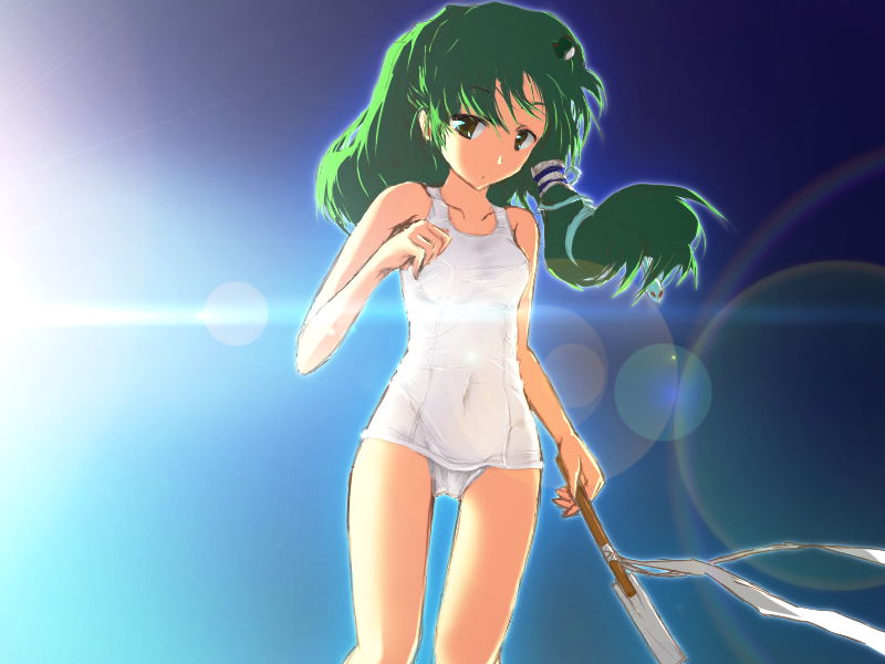 1girlfemale focusfroggradient backgroundgreen hairlens flarelong hairone-piece swimsuitschool swimsuitsoloswimsuitwhite one-piece swimsuitwhite school swimsuit