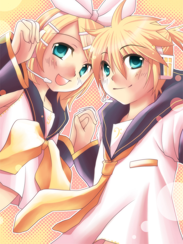 1boy1girlaqua eyesblonde hairbowbrother and sisterdetached sleeveshair ornamenthair ribbonhairclipheadphonesheadsetholding handsribbonshort hairsiblingstwins