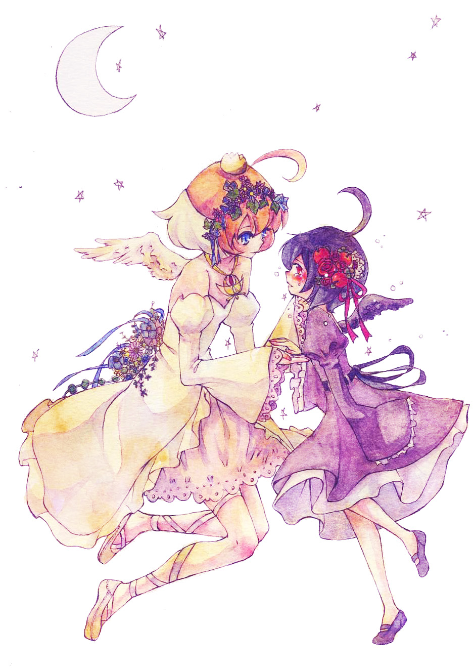 00s2girlsaged downahogeballerinaballetballet slippersblack hairblonde hairblue eyescrescent mooncrowndressflowerhair flowerhair ornamenthead wreathlacemoonmulticolored hairmultiple girlsred eyesribbonrosy cheeksshoesshort hairstar (symbol)tearstututwo-tone hairwings