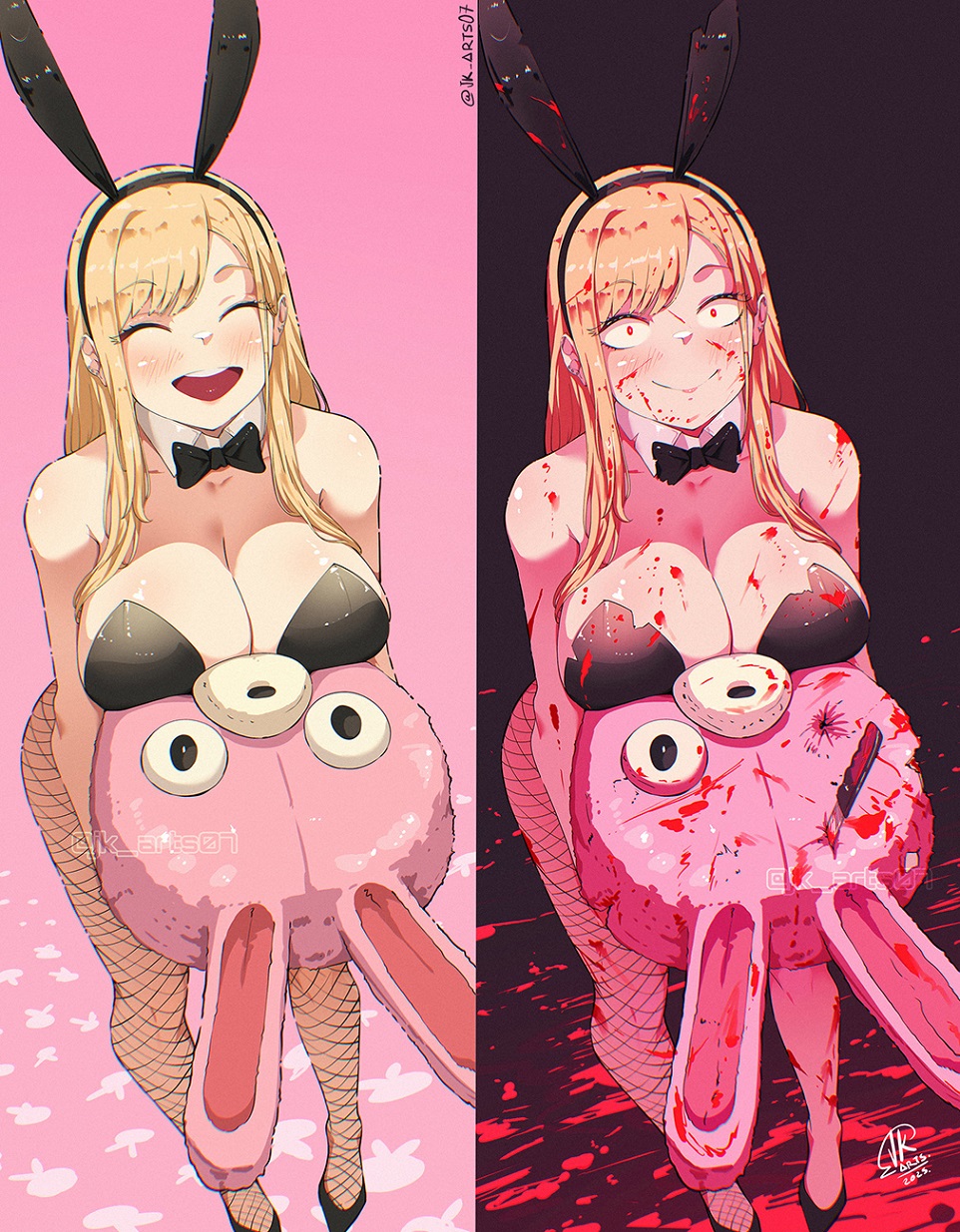 1girlanimal earsblack leotardblonde hairbloodblood in hairblood on clothesblood on faceblood splatterbowbowtiebreastscleavagedetached collarfake animal earsfishnet pantyhosefishnetslarge breastsleotardlong hairopen mouthpantyhoseplayboy bunnyrabbit earssmilestraplessstrapless leotardstuffed animalstuffed toy