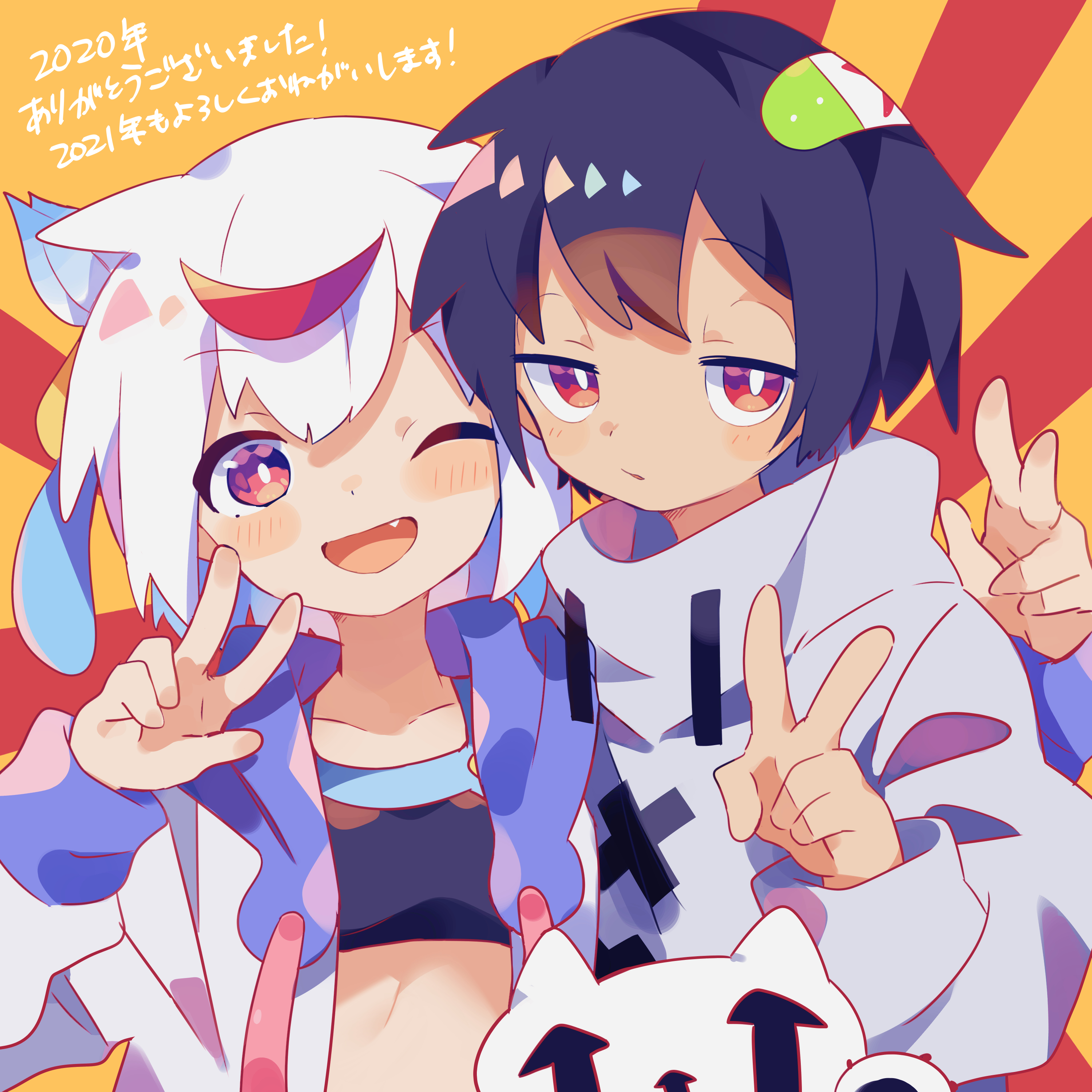 :d1boy1girlblack hairblush stickersbright pupilscollarbonefanghand uphoodhood downhoodielong sleeveslooking at viewernew yearone eye closedopen clothesopen hoodieopen mouthparted lipsred eyesshort hairsmileupper bodyvwhite hairwhite hoodiewhite pupils