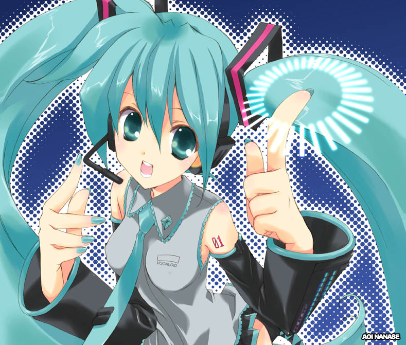 aqua eyesaqua hairdetached sleevesheadphoneslong hairmicrophonenecktieskirttwintailsvery long hair