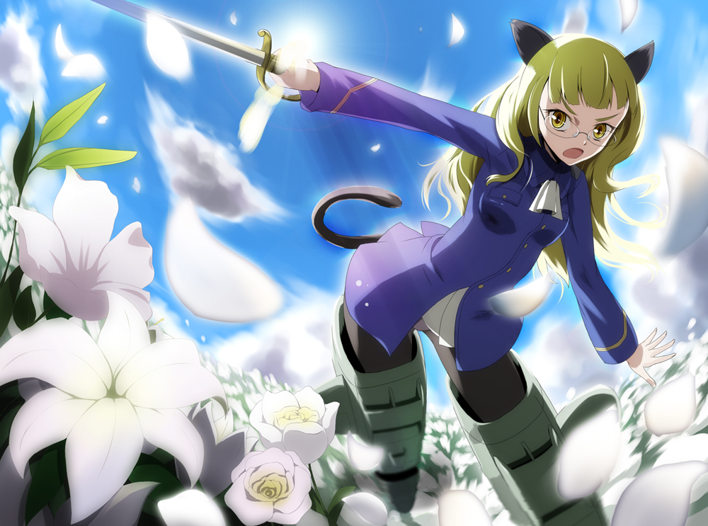 00s1girlanimal earsblonde haircat earscat tailfemale focusflowerglasseslong hairpantiespanties under pantyhosepantyhosesolostriker unitswordtailunderwearweaponyellow eyes