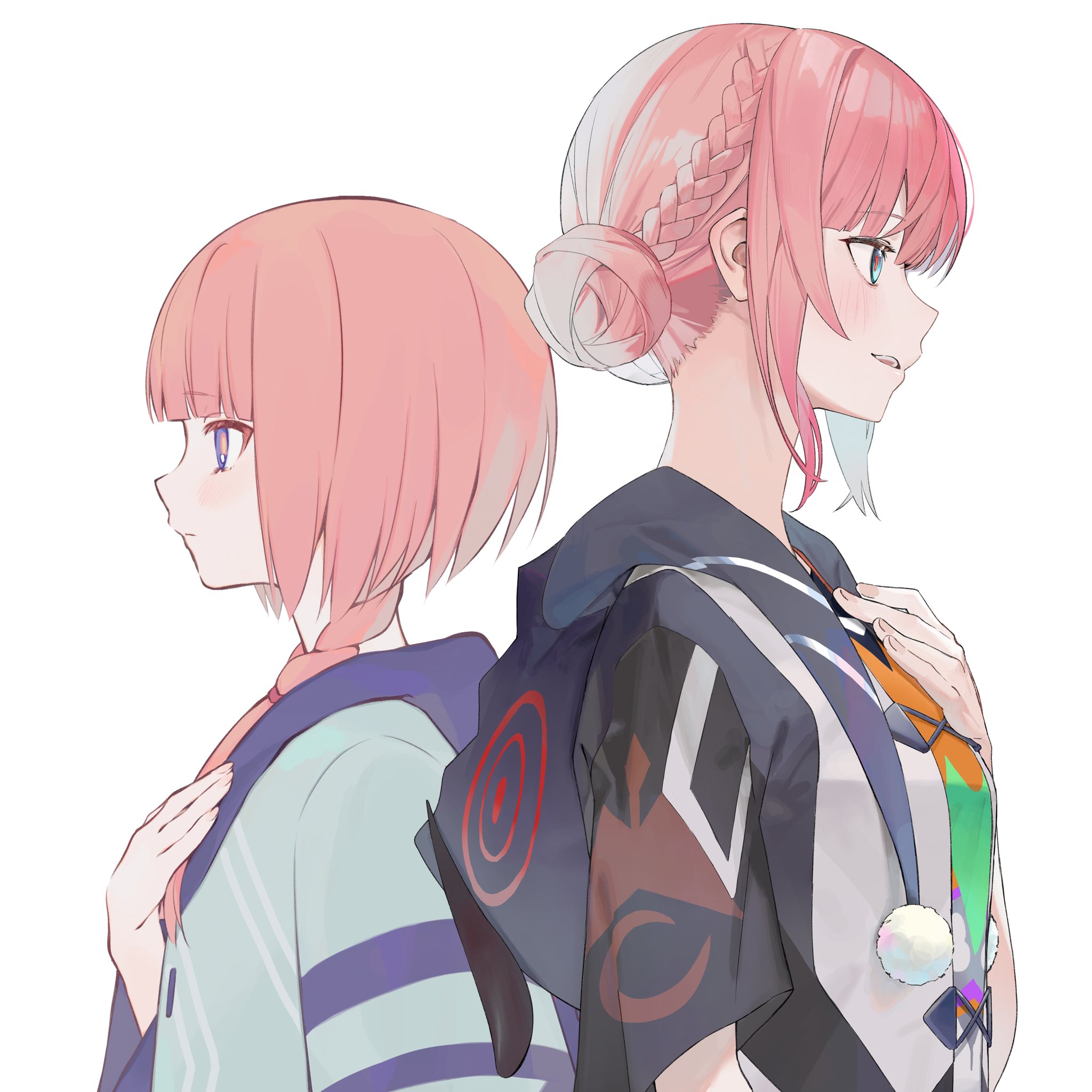 2girlsblack hoodieblue eyesbraidclosed mouthdual personahand on own chesthoodhoodiemultiple girlsopen mouthpom pom (clothes)profileshirtsimple backgroundsmileteethupper bodyupper teeth onlyvirtual youtuberwhite backgroundwhite shirt