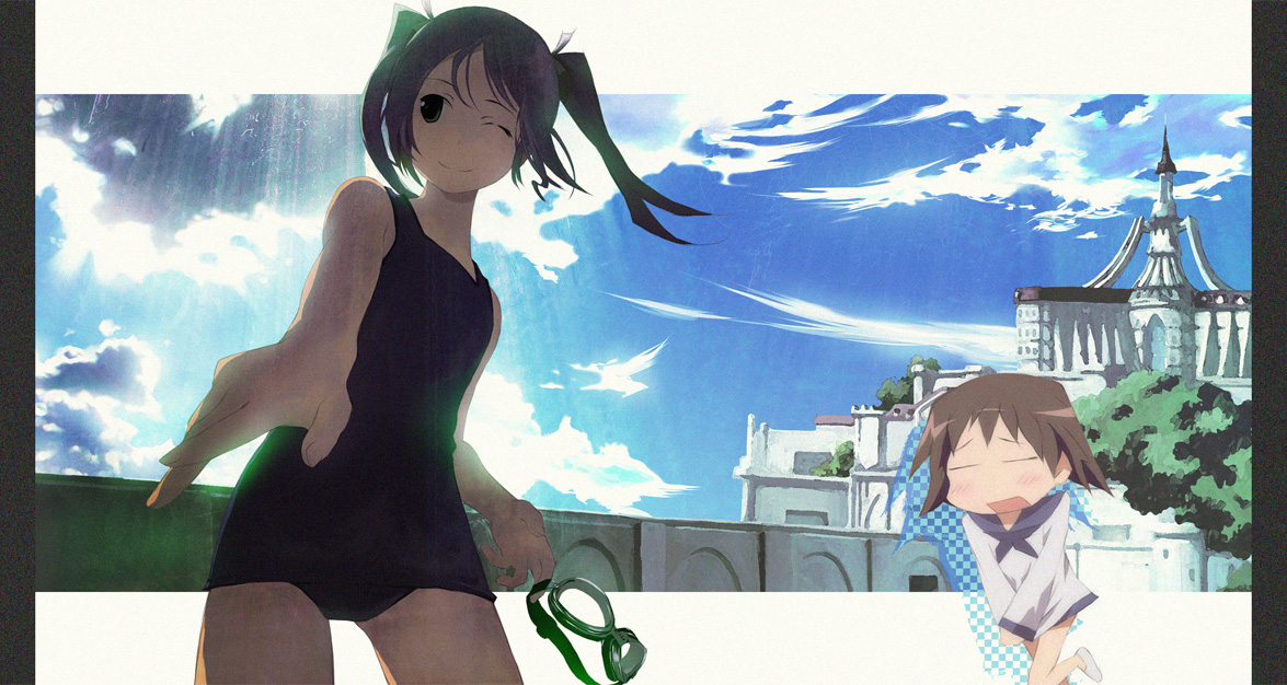 00s2girlscastlecloudgogglesmultiple girlsone eye closedone-piece swimsuitschool swimsuitschool uniformswimsuittwintailswink
