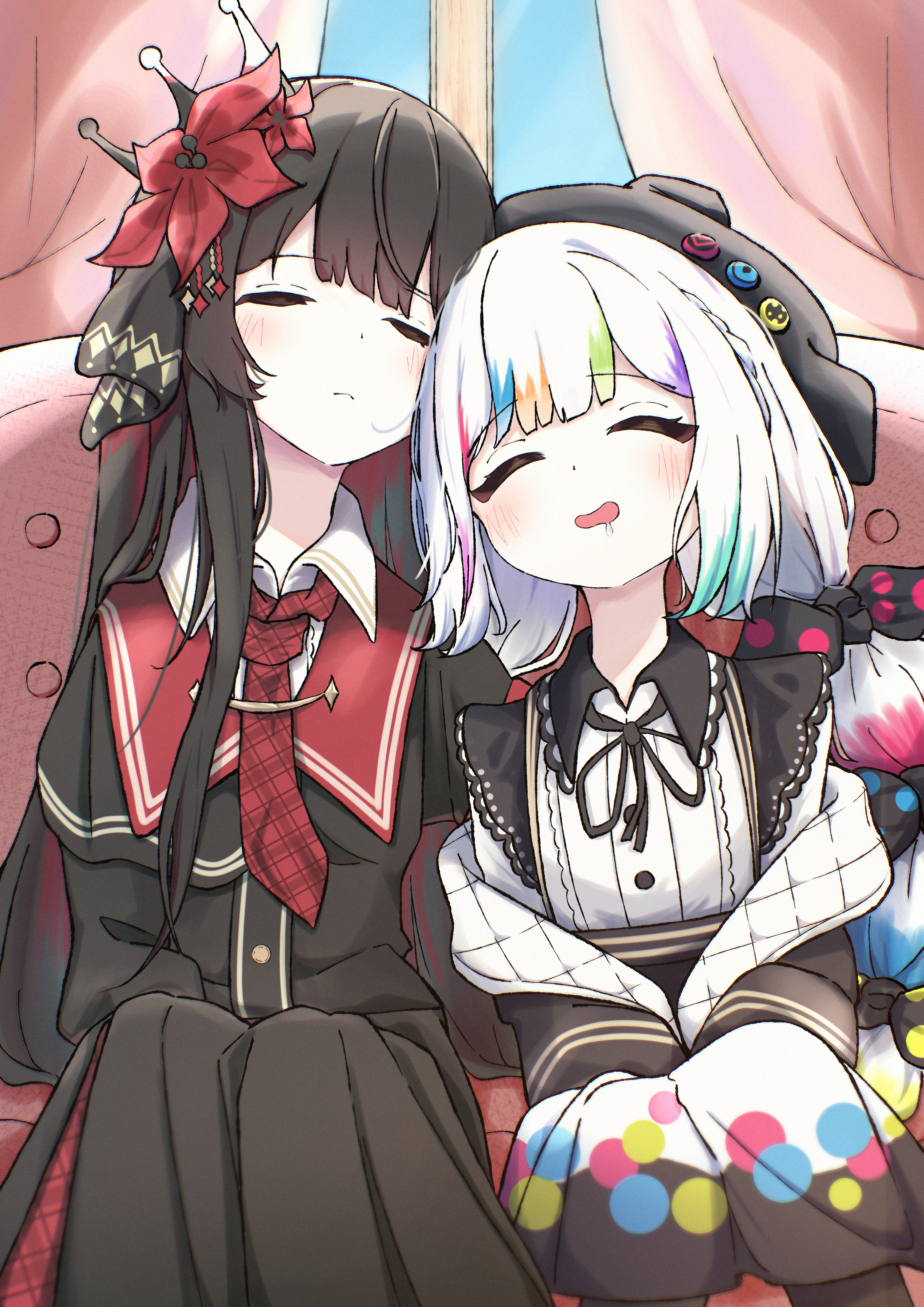 2girlsartist painterblack dressblack hairbowclosed eyescouchcrowndressflowerhair flowerhair ornamenthime cutlong hairmagical girlmulti-tied hairmultiple girlsnecktieon couchpaint stainspolka dotpolka dot bowred flowerred necktiesalivasleepingsleeping on personvery long hairwhite hair