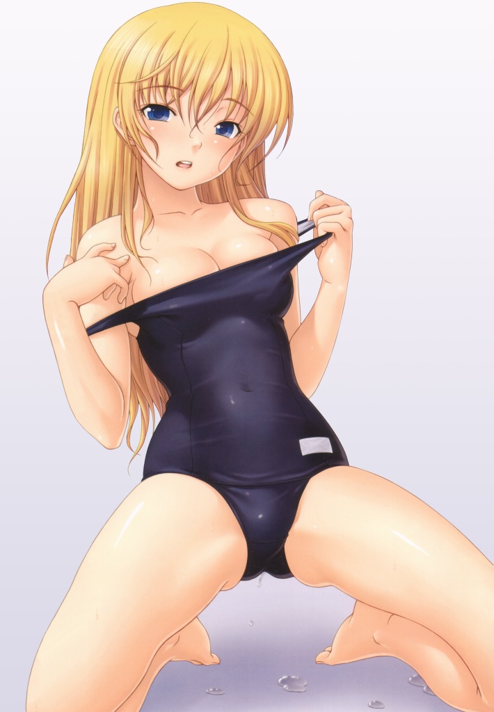 1girlbarefootblack one-piece swimsuitblonde hairblue eyesbreastsclothes pullcovercover pagefemale focuskneelinglong hairmagazine coverone-piece swimsuitone-piece swimsuit pullpulling own clothesschool swimsuitsoloswimsuitundressing