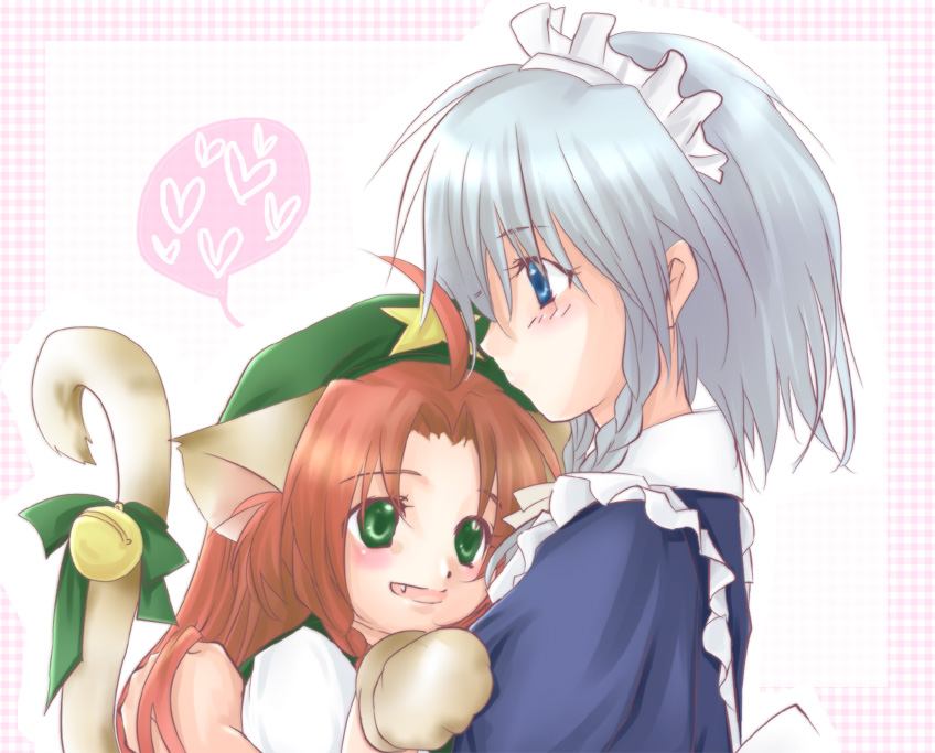 2girlsanimal earsblue eyesblushcat earscat girlcat tailfemale focusgreen eyeshairbandhatmaidmultiple girlsred hairribbonshort hairtailupper body