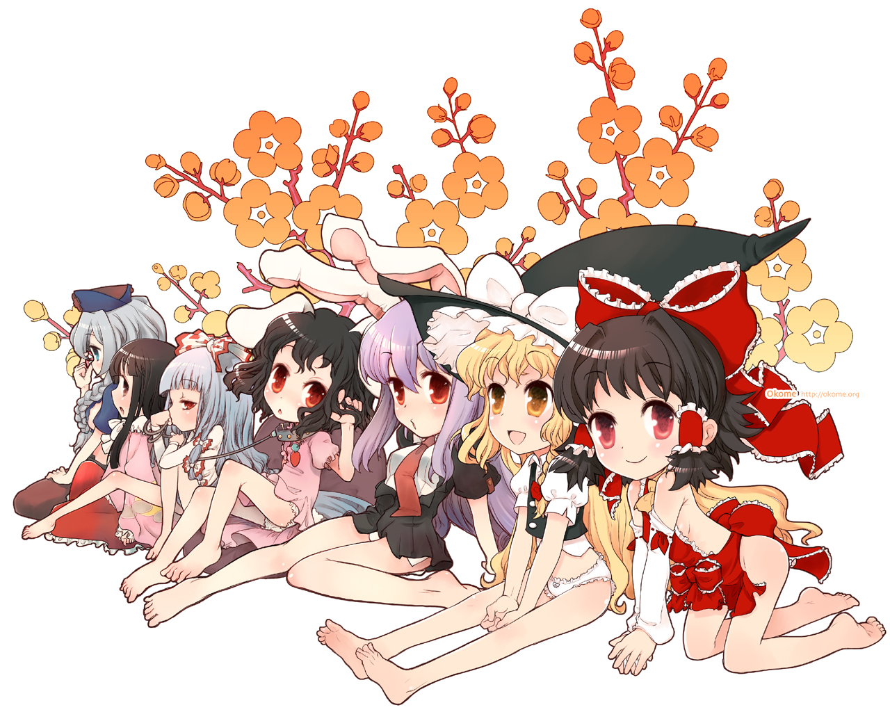 6+girlsanimal earsbarefootblack hairblonde haireveryonefeetfemale focushatmultiple girlspantiespurple hairrabbit earsred eyesribbonsolestoesunderwearyellow eyes