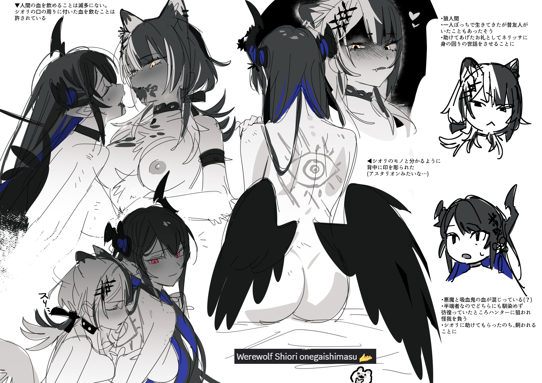 1boy2girlsafter kissanimal ear fluffanimal earsarm straparousedassasymmetrical hornsbackback tattoobite markbite mark on armbite mark on shoulderbloodblood from mouthblood on faceblue streaksblushbody furbreastsbreasts apartchokercolored inner haircompletely nudecoupledemon girldemon hornsdemon wingsemojieye tattoofacing anotherfangfeathered wingsflipped hairfront-to-backgreyscalehair ornamenthair ribbonhand on own shoulderhearthornskemonomimi modelarge breastslong hairlooking at anotherloose hair strandlow ponytaillow wingsmonochromemulticolored hairmultiple girlsmultiple viewsnapenipplesnose blushnudeparted lipspointy earsponytailprofilered eyesrequest insetribbonromaji textsalivasaliva trailshaded facesittingsplit-color hairstreaked hairsweatdroptattootwo-tone hairuneven hornsvirtual youtuberwhite backgroundwingswolf earswolf girlyellow eyesyuri