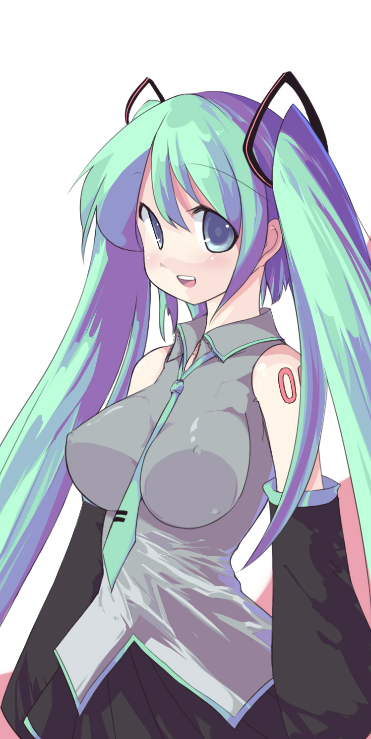 1girlaqua hairblue hairbreastscovered erect nipplesdetached sleevesfemale focusimpossible clothesimpossible shirtlarge breastslong hairnecktieshirtsimple backgroundsolotwintails