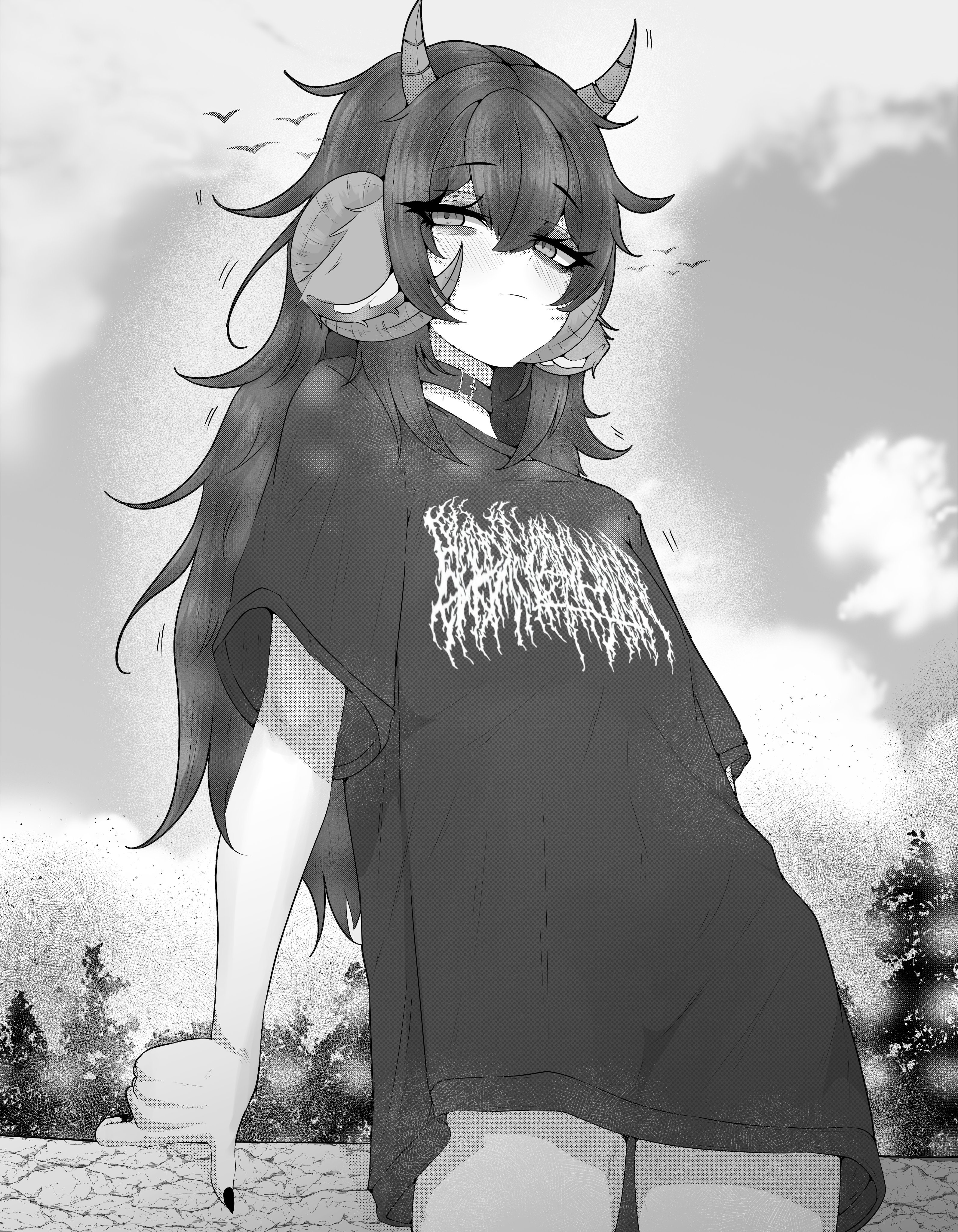 1girlanimal earschokerclosed mouthclothes writingcloudcowboy shotcrossed bangsdakotakvltdouble-parted bangsgreyscalehair between eyeshornslong hairlooking at viewermonochromeoutdoorssheep earssheep girlsheep hornsshirtshort sleevesskysolot-shirtvirtual youtuber