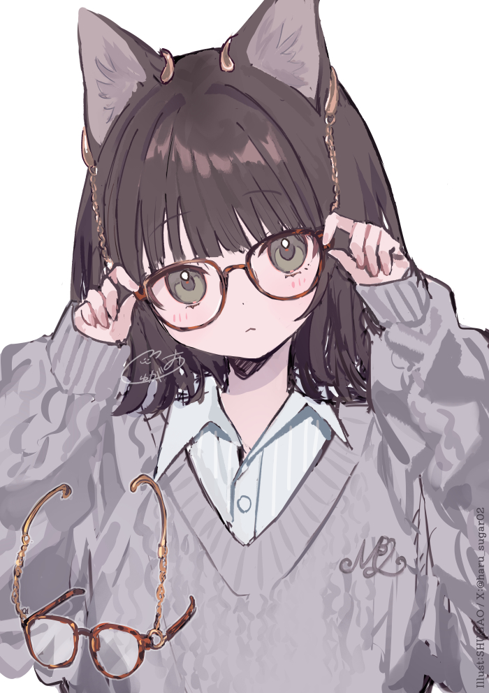 1girlanimal ear fluffanimal earsblunt bangsblushbrown haircat earscat girlclosed mouthglassesgreen eyeslong sleeveslooking at viewermedium hairsimple backgroundsolosweaterupper bodywhite background