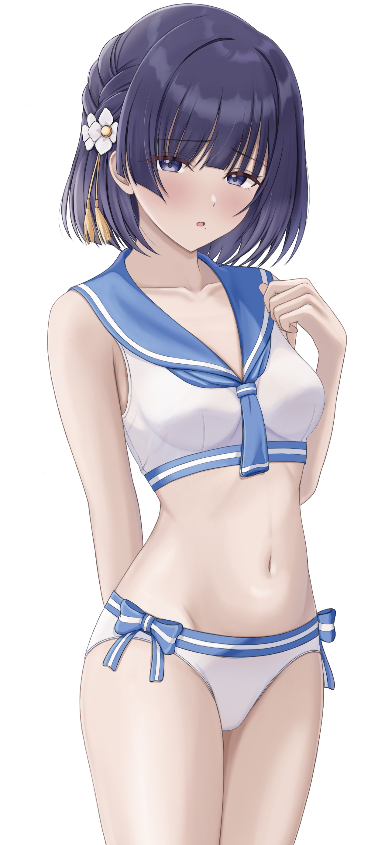 1girlarm behind backbare armsbikiniblue neckerchiefblue sailor collarblushbraidbreastscollarbonecowboy shotlooking at viewermedium breastsmolemole under mouthnavelneckerchiefopen mouthsailor bikinisailor collarsailor swimsuit (idolmaster)short hairside braidsimple backgroundsleevelesssolostomachswimsuitthighswhite backgroundwhite bikini