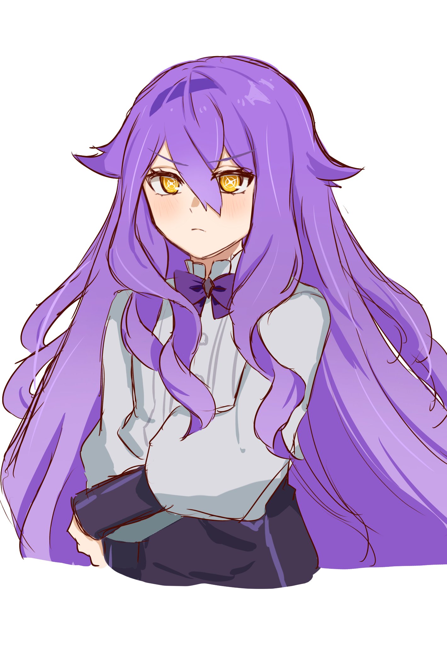 1boy1girlblack skirtblushbowclosed mouthfrowngb nenigegrey shirthair between eyeslong hairlong sleeveslooking at viewerpuffy long sleevespuffy sleevespurple bowpurple hairshirtsimple backgroundskirtsolov-shaped eyebrowsvery long hairwhite backgroundyellow eyes