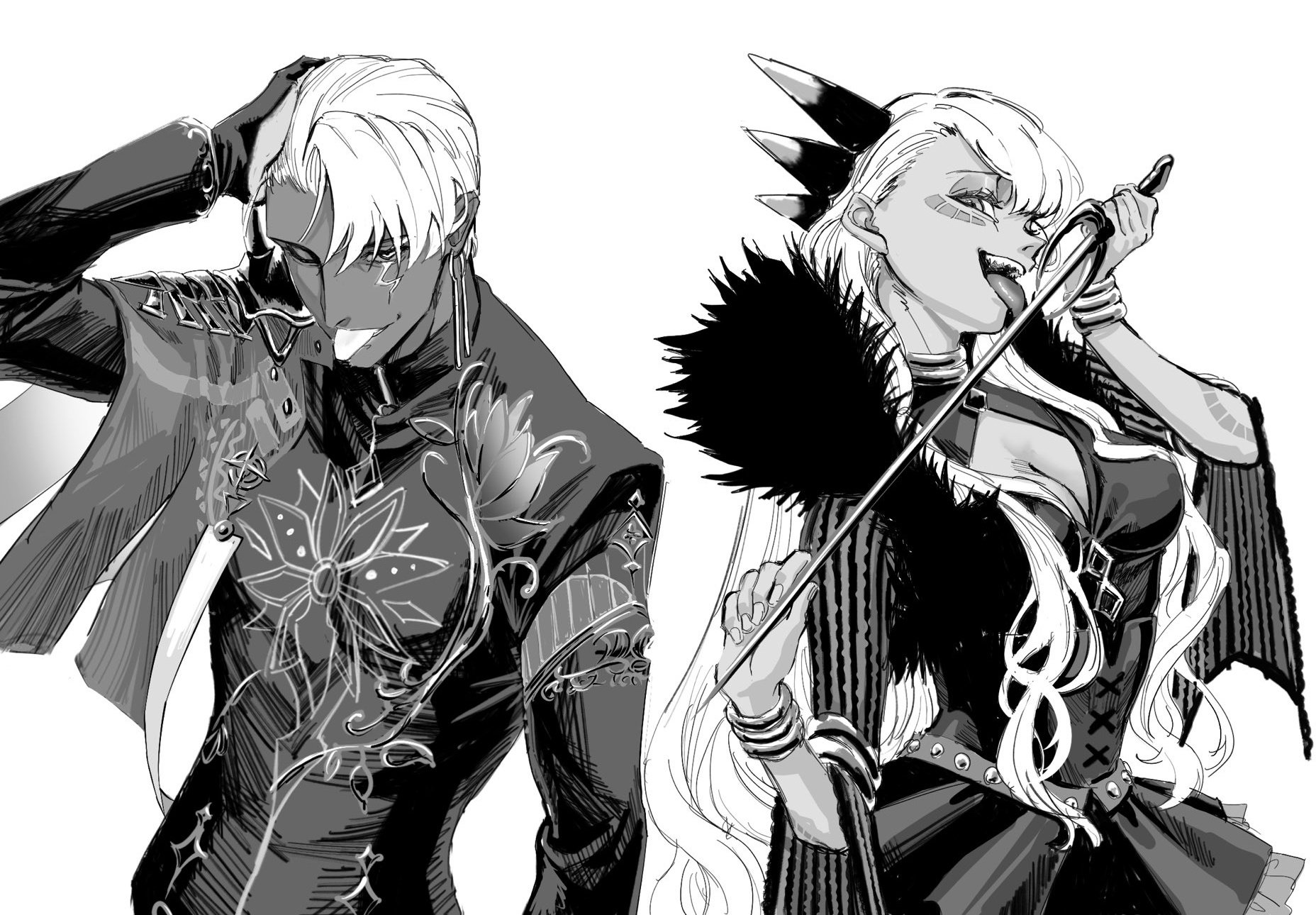 1boy1girlblack dressbreastscleavagedark skindark-skinned femaledark-skinned maledragon girldragon hornsdressearringsfacial markfur-trimmed shruggreyscalehornsjacketjewelrylickinglightning bolt facial marklightning bolt symbolmonochromeneck ringsaijindansharp teethshrug (clothing)simple backgroundswept bangsteethtonguetongue outturtleneckturtleneck jacketwhite background