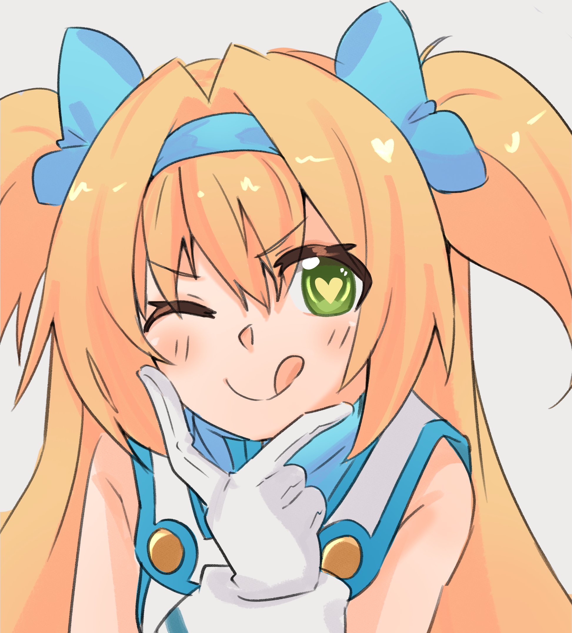 1girlblonde hairblue ribbonblushglovesgreen eyeshair between eyeshair ribbonheartheart-shaped pupilslocal loli lunalong hairlooking at viewerone eye closedribbonsmilesolosymbol-shaped pupilstonguetongue outtwintailswhite gloves