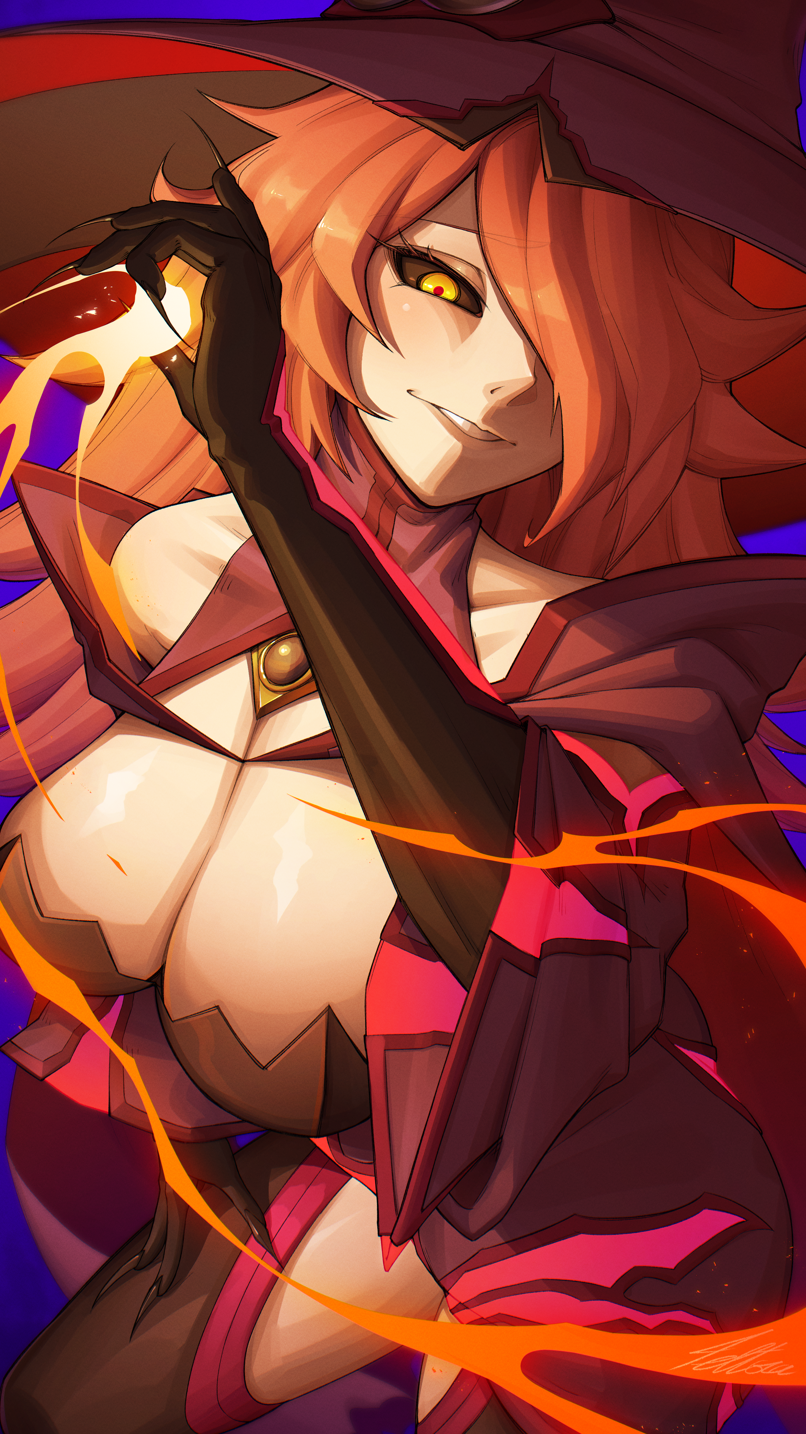 1girlblack glovesblack sclerabreastscleavagecolored scleraelbow glovesfingernailsglovesgrinhair over one eyehand on own leghatlarge breastslong fingernailslong hairmagicsharp fingernailssingle bare shouldersmilesolowitchwitch hatyellow eyes