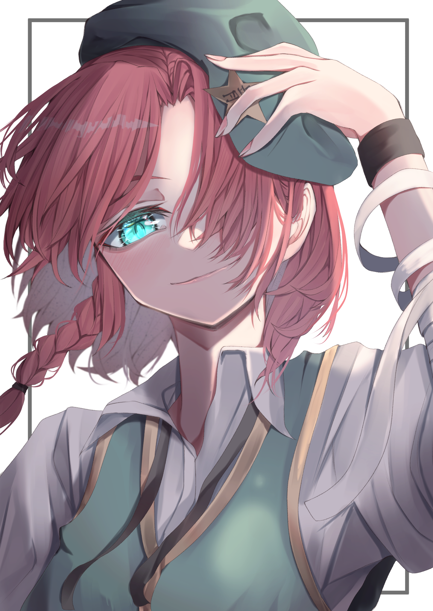1girlalternate hair lengthalternate hairstyleaqua eyesbandaged armbandagesberetbraidcurtained hairfingernailsgreen hatgreen vesthair over one eyehathat ornamentlight smilelooking at viewernail polishone eye coveredorange hairshirtshort hairsingle braidsolostar (symbol)star hat ornamentupper bodyvestwhite shirtwristband