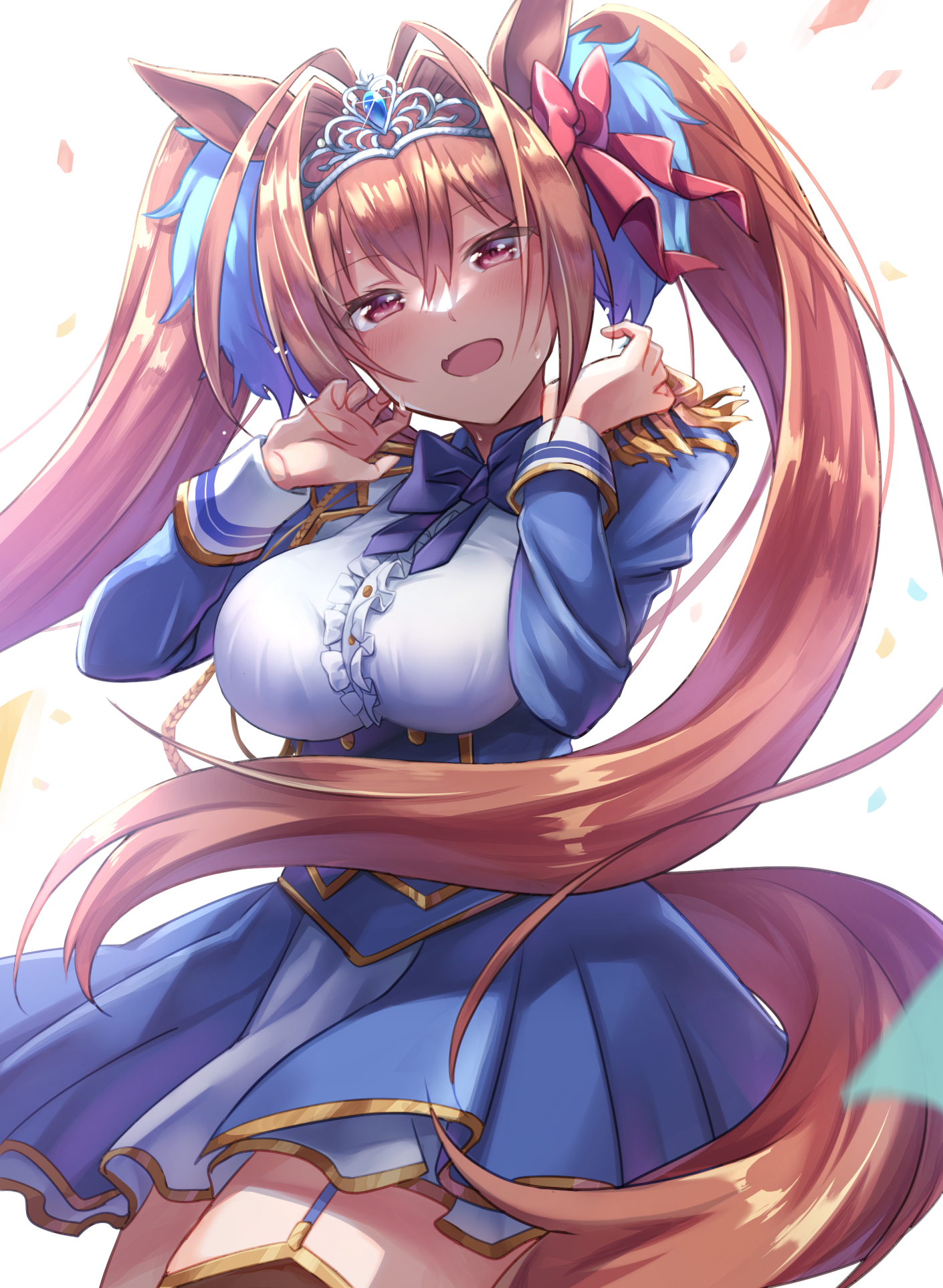 tabii, orie ballardiae harada, under night in-birth, highres, 1girl, ahoge, black dress, blue eyes, blue hair, blue panties, blush, breasts, cowboy shot, dress, grey background, holding, holding sword, holding weapon, large breasts, open mouth, panties, pussy, side-tie panties, simple background, skindentation, smile, solo, striped clothes, striped panties, sword, thighhighs, two-tone panties, underwear, weapon, white panties, white thighhighs