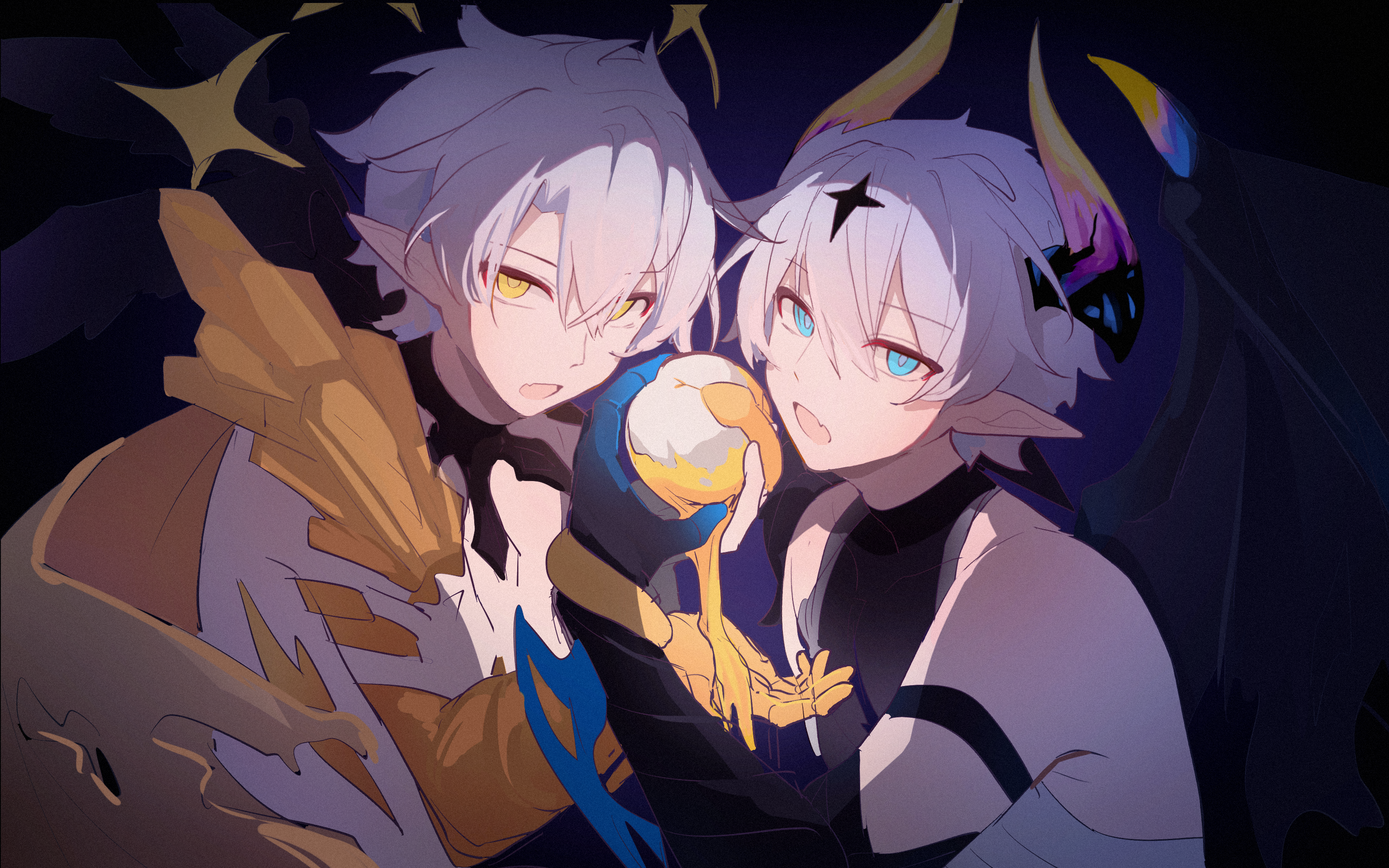2boysalternate costumealternate universebare shouldersblue eyescolored skindark roomdemon hornseggfrom sideglowinghair between eyeshair ornamenthead tiltholdinghornsintermittent-resetleaning forwardleaning to the sidelooking at viewerlooking to the sidemulticolored skinmultiple boysopen mouthpointy earsscarshadeshort hairsleevelessstar (symbol)star hair ornamenttwo-tone skinwhite hairyellow eyes
