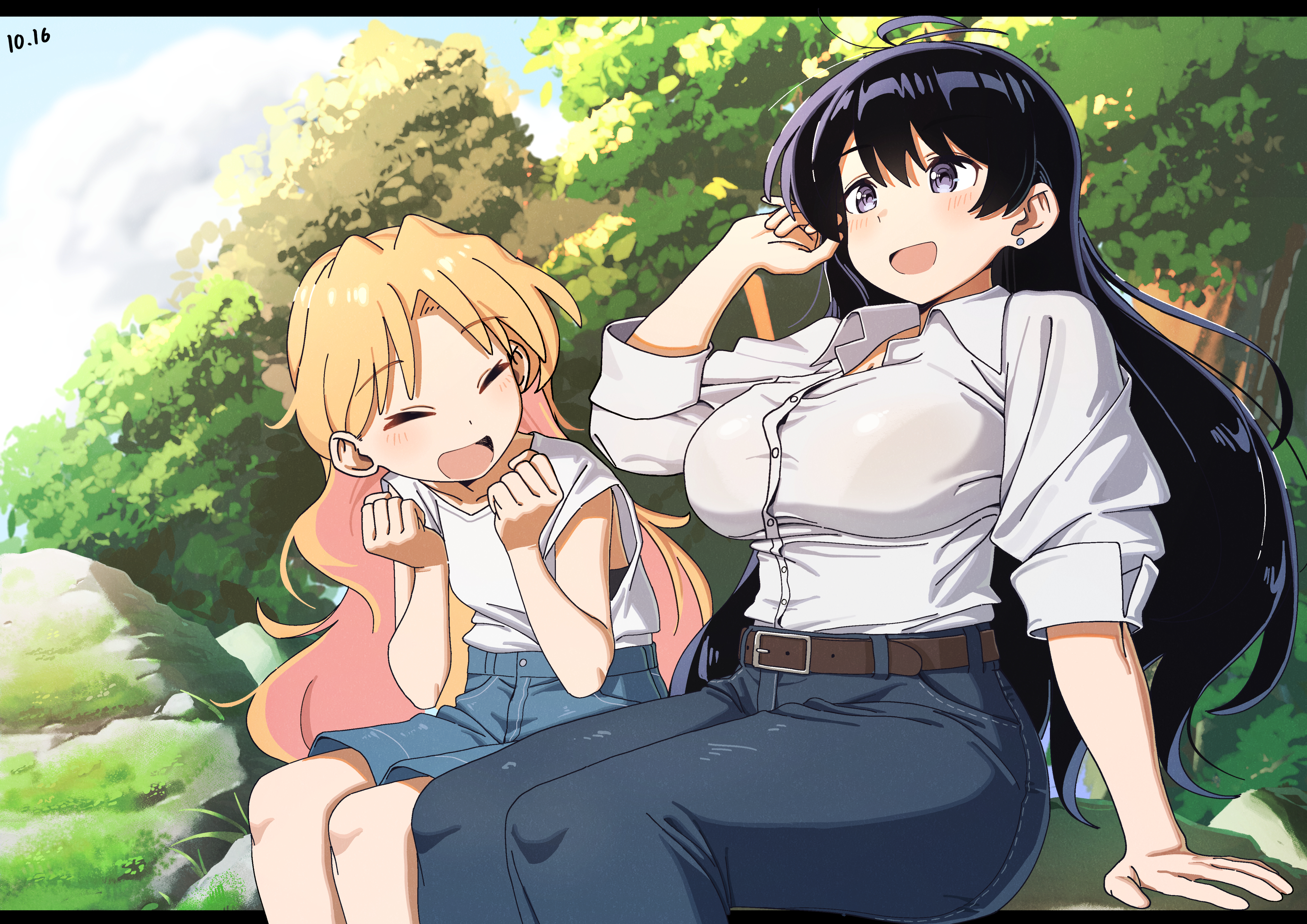 :d2girlsarm supportbeltblack brablack hairblue pantsblue shortsblushbrabra visible through clothesbreastsclosed eyescloudcloudy skycollared shirtdateddenimdenim shortsearringshappyjeansjewelrylarge breastsleafletterboxedlong hairlong sleevesmossmultiple girlsopen mouthorange hairoutdoorspantsparted bangspurple eyesrockshirtshortssittingskysleevelesssleeveless shirtsmilestud earringstreeunderwearvery long hairwhite shirt