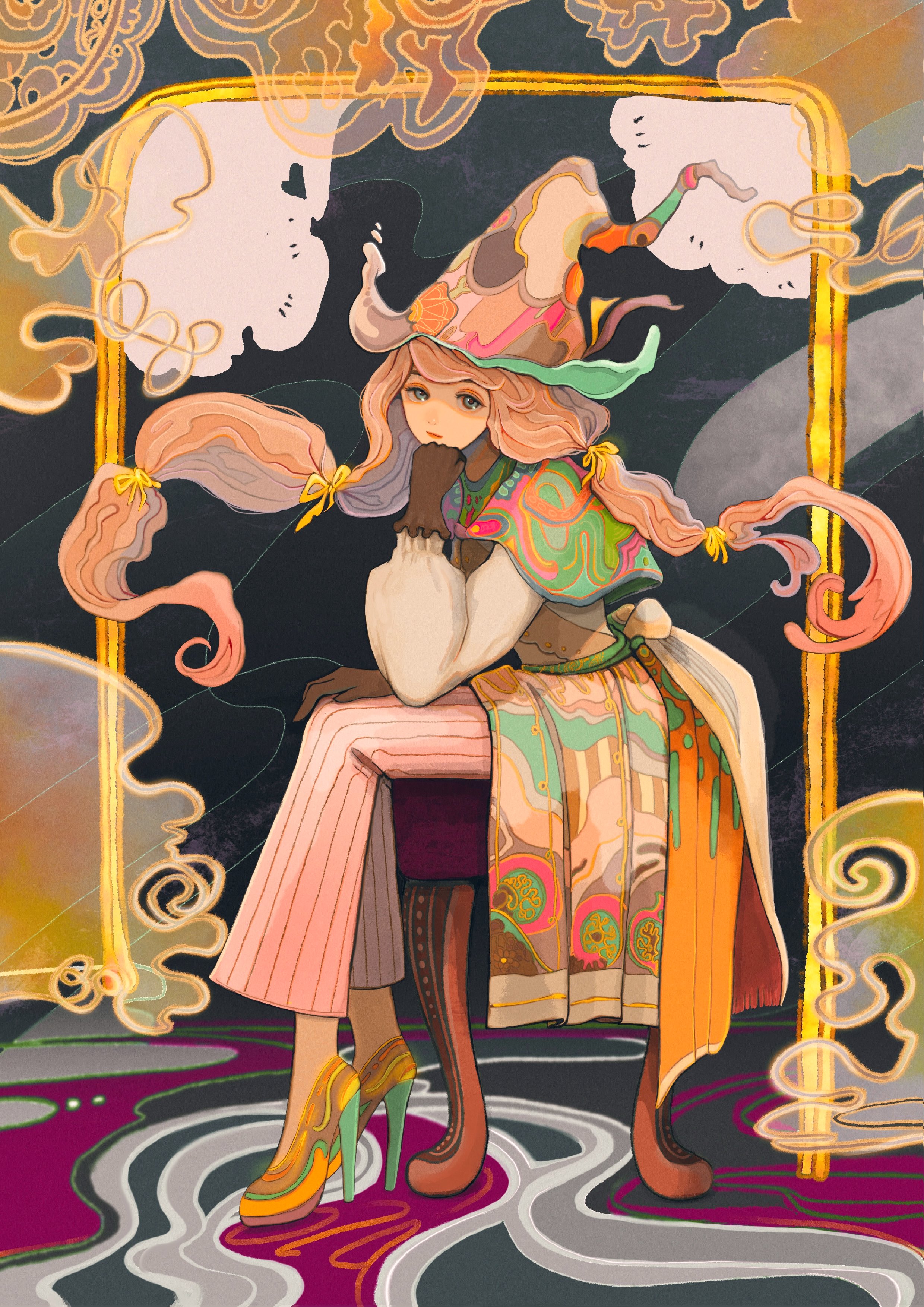 1girlbrown gloveschairclosed mouthfull bodyglovesgreen eyeshathigh heelslarge hatlong hairlong sleeveslooking at viewerpink hairsittingsolowitch hat