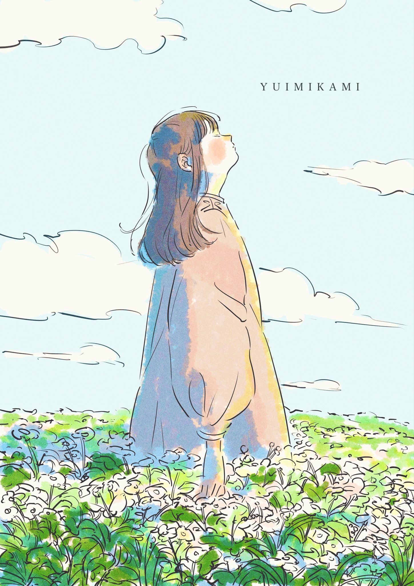 1girlartist nameblue skybrown hairclosed eyesclouddaydressfieldflowerflower fieldlong sleevesoutdoorspink dressprofileskysolostandingsunlightwhite flower