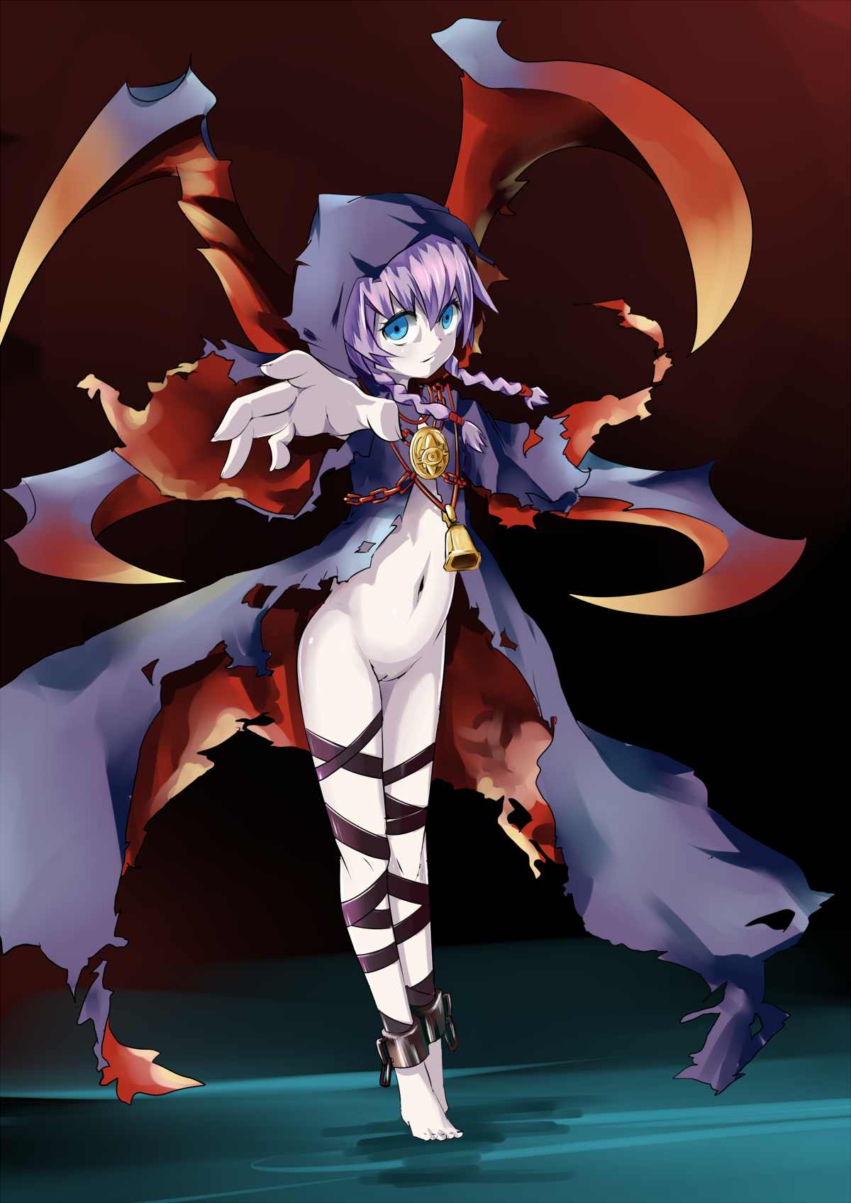 amuletaqua eyesbarefootbellbraidchainscloakcuffsfeetfemaleFlag for Deletionfull lengthfull-length portraithoodjewelrylavender hairlong hairlooking at viewernavelnecklacenudeoutstretched armsoutstretched handportraitpussyreachingscytheshacklesolostandingthigh straptied hairtoestorn clothestwin braidstwintailsuncensored